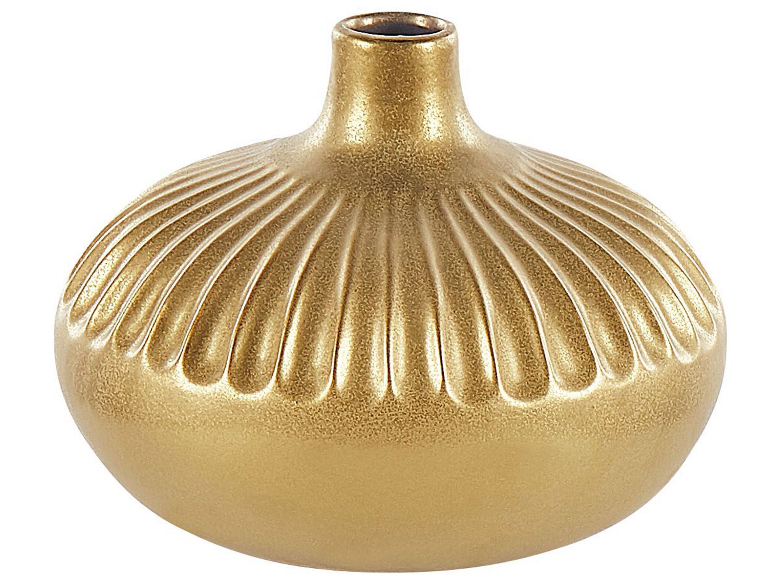 Boasting a rounded, ribbed form, this vase will add a striking visual touch to any home décor. This crafted from stoneware piece features a bold gold finish that gives it a luxurious feel. It makes for a stunning decoration on its own, but you can dress it up with some flower stalks for a more welcoming look. Details: Color: Gold. Main material: Stoneware. Weight: 2 Assembly: Does Not Require Assembly