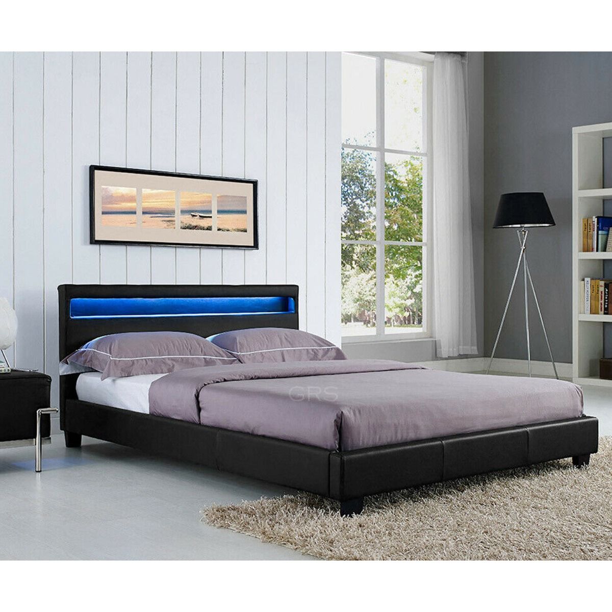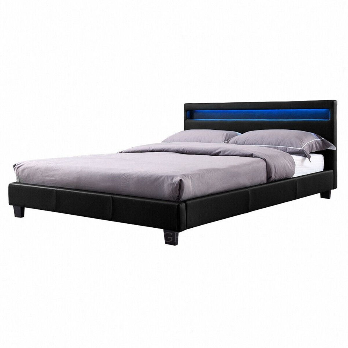 This is a fantastic contemporary faux leather a double size bed frame. This designer bed comes in a black faux leather. Made from faux leather this beautiful bed has a high padded headboard with LED lights and a low foot end. Perfect for providing a focal point to your bedroom or a night light for children. This bed frame has a posture sprung slatted base. It takes a standard double size mattress.