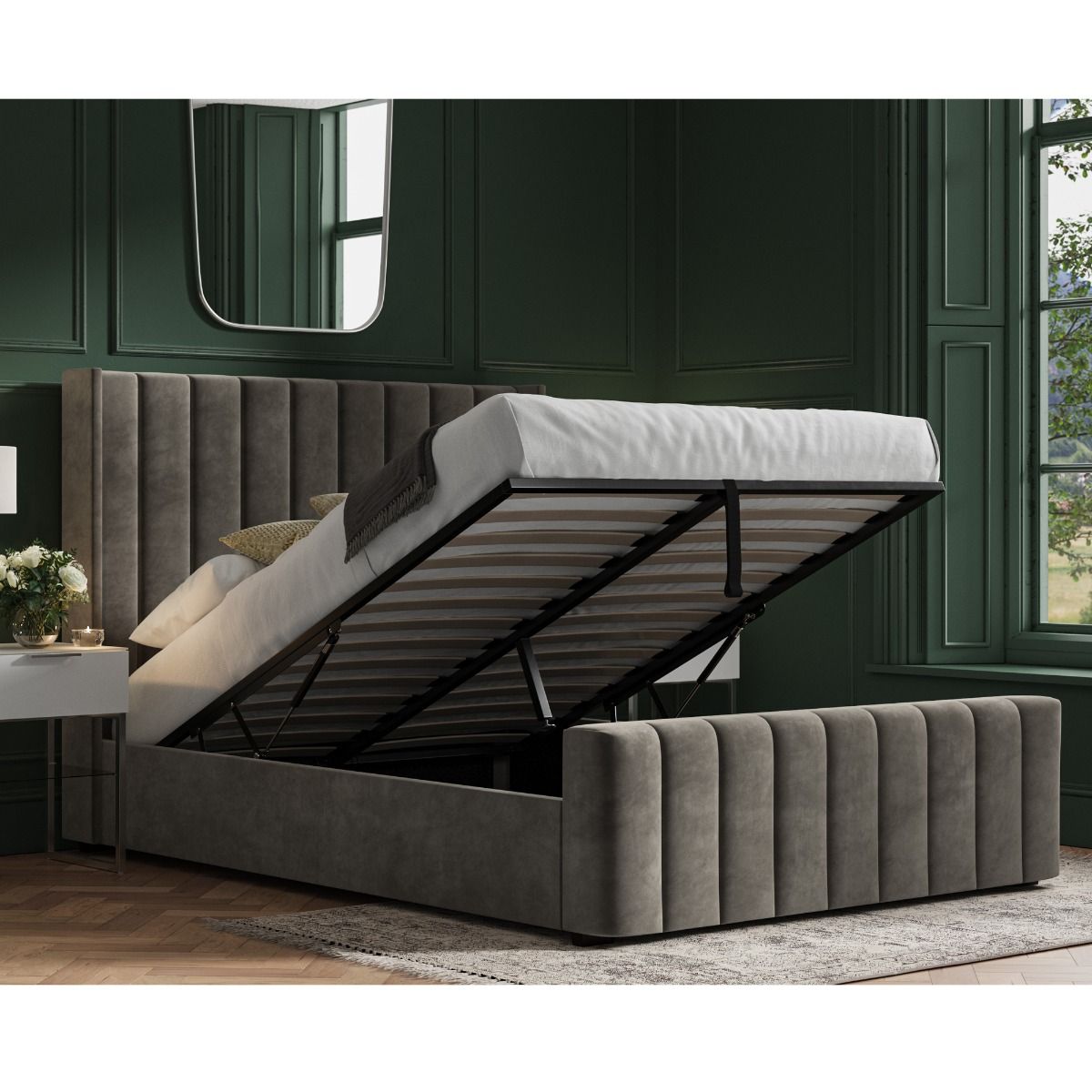 Stylish Wings Design Headboard Kilworth Mid Grey Velvet Ottoman Bed - Super Kingsize