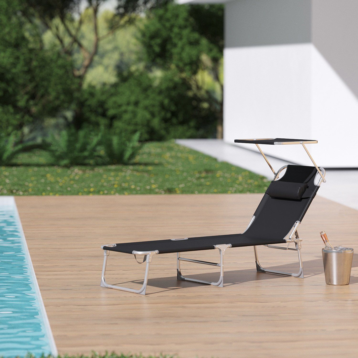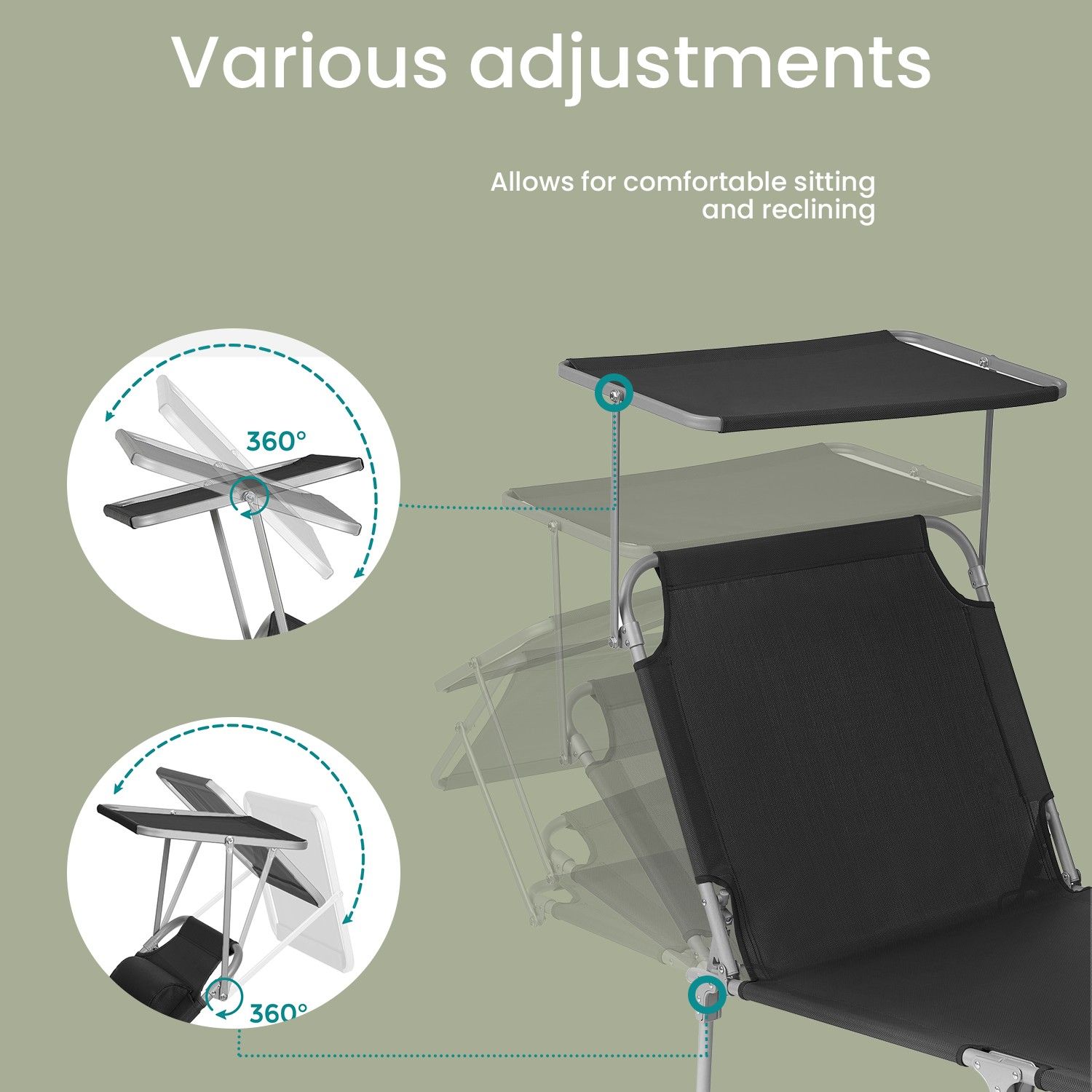 Relax in style with this versatile folding sun lounger. Perfect for your garden, patio, or beach, it features an adjustable backrest for ultimate comfort, a built-in sunshade to protect you from the sun, and a convenient headrest. With a sturdy design supporting up to 150 kg and a compact folding mechanism, it's easy to store and transport. Enjoy your leisure time with this practical and comfortable sunbed.