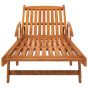 This wooden sun lounger set combines style and functionality and will add a touch of rustic charm to your garden, patio, pool deck or other outdoor living space. Constructed from solid acacia wood, the sun lounger is weather-resistant, durable and suitable for outdoor use. Equipped with wheels, it can be easily moved around. The backrest and footrest are adjustable from sitting fully upright to lie completely flat, which offers you the utmost comfort. Note: In order to extend the life of your outdoor furniture, we recommend you to clean it regularly and do not leave it outdoors without protection unnecessarily.Clean: Use a mild soap solution.Storing: If possible, store in a cool, dry place indoors. If the product is stored outdoors, protect it with a waterproof cover. Wipe and dry the excess water or snow from flat surfaces after a rain or snowfall. Allow sufficient air circulation to avoid moisture-related damage.