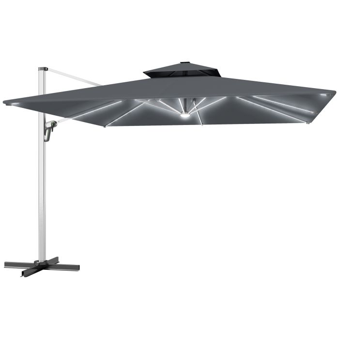 SUNVISTA 3(m) Garden Cantilever Parasol with Solar LED Lights, Cross Base, 360degree Rotation, Crank Handle and Tilt, Grey