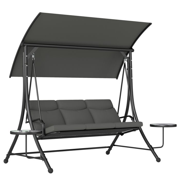 A classic patio swing with a sleek update - two glass tables: this SUNVISTA swing bench is before than ever before. With a steel frame for a strong core, plus the 'A' legs to stand balanced. Three-seater size offers plenty of room to relax, with a padded seat and back cushion for comfort. The round glass-top tables on each side give you somewhere safe to keep drinks, magazines and more within easy reach. Comes with an adjustable canopy to shelter from the elements.