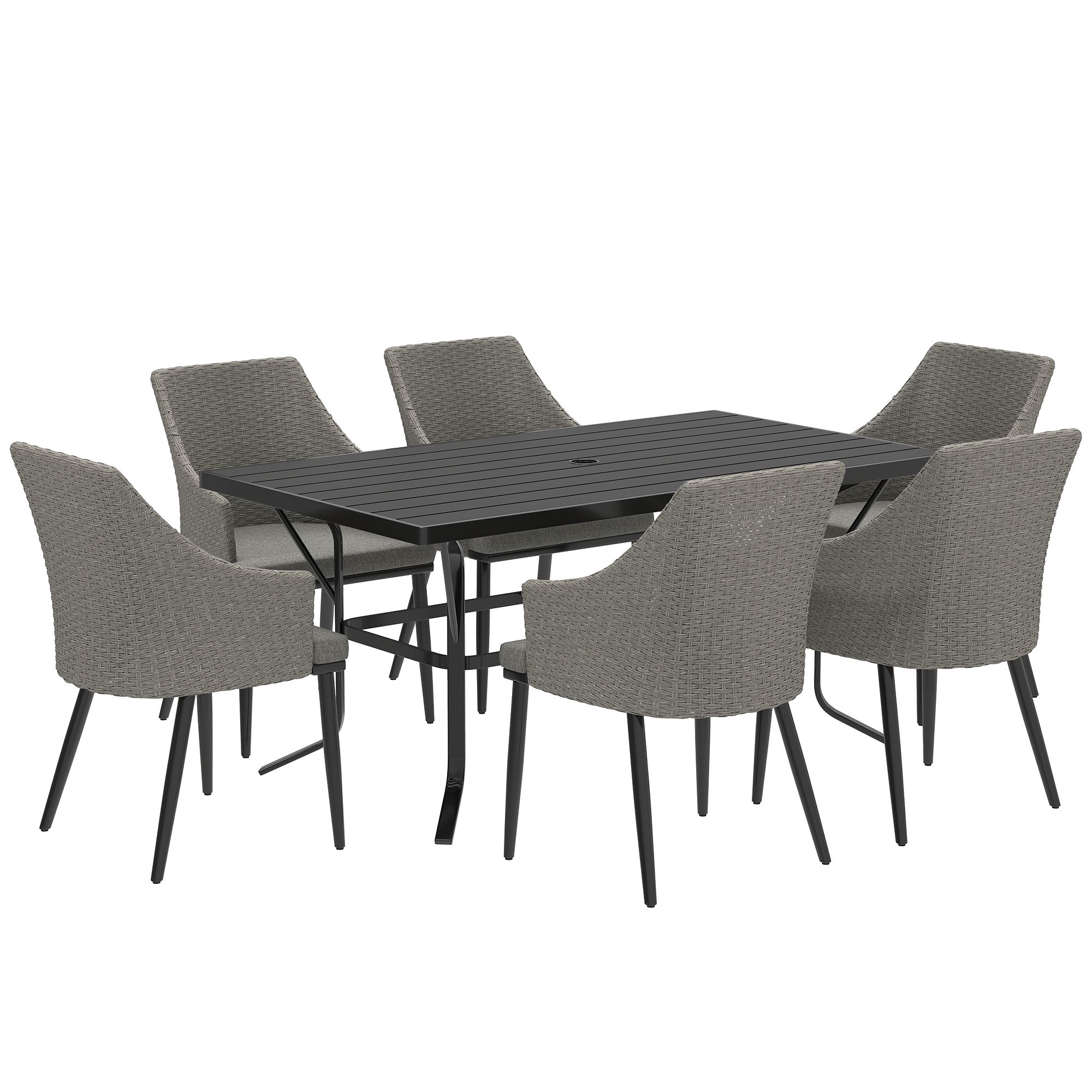 SUNVISTA 6-Seater Rattan Dining Set with Cushions, Slatted Table & Parasol Hole, Outdoor Patio Furniture, Grey