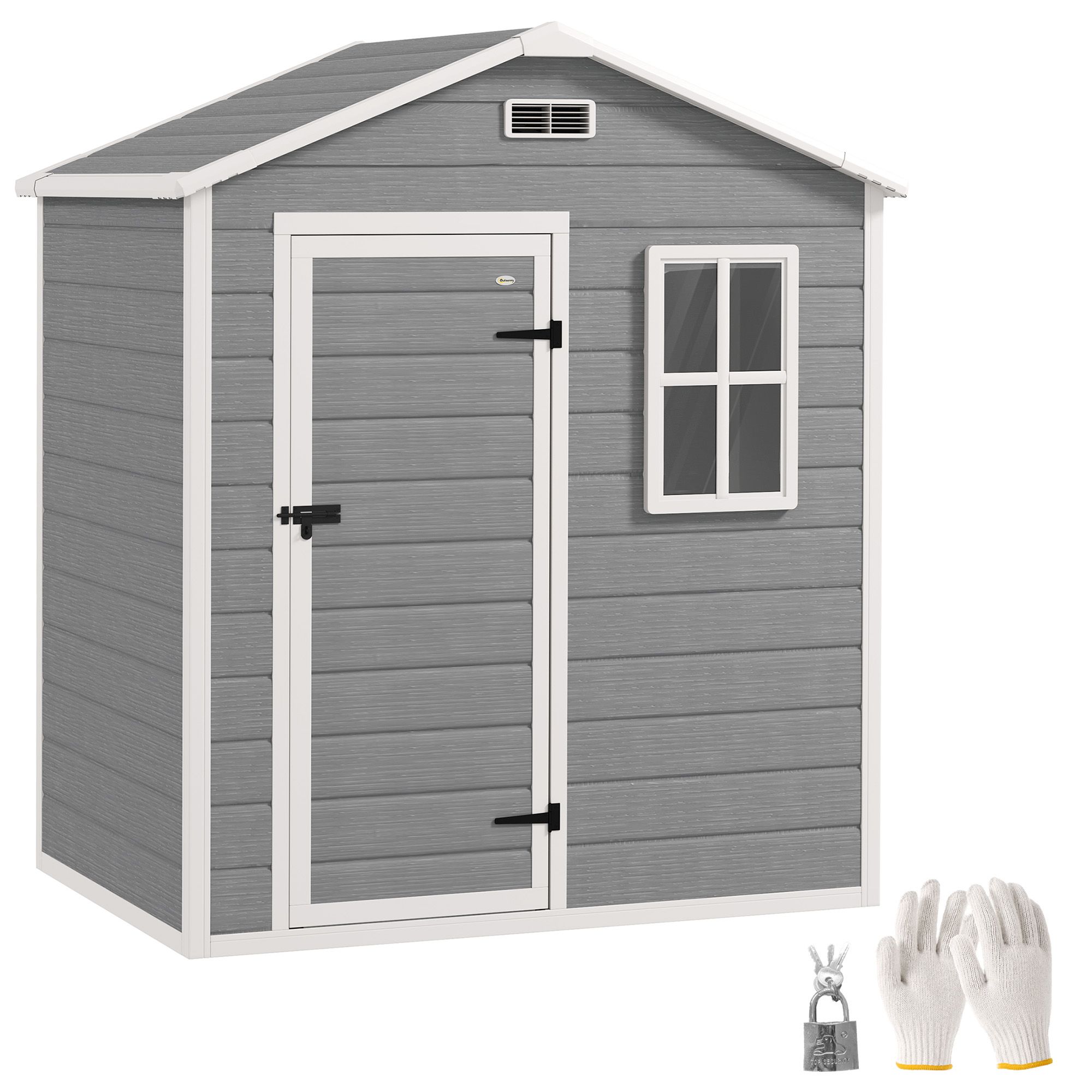 SUNVISTA 6 x 4ft Garden Shed, Plastic Shed with Floor, Window, Lockable Door and Vents, Wood Effect Resin Tool Shed for Outdoor, Grey