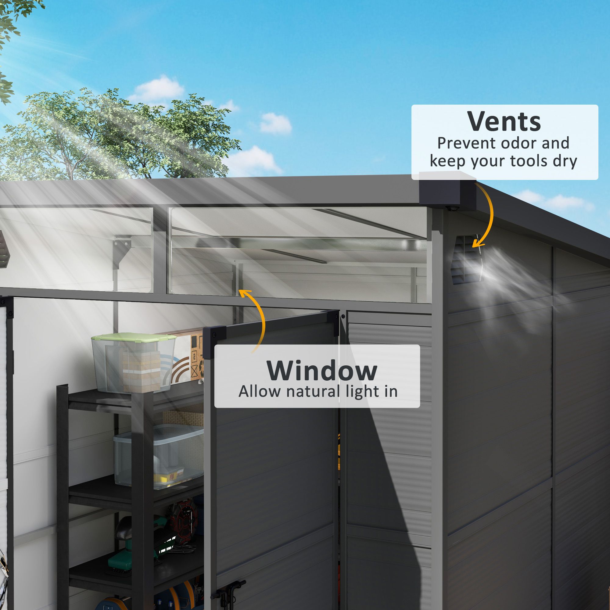 SUNVISTA 6 x 6ft Outdoor Storage Shed, Plastic Garden Shed with Windows and Air Vents, Dark Grey