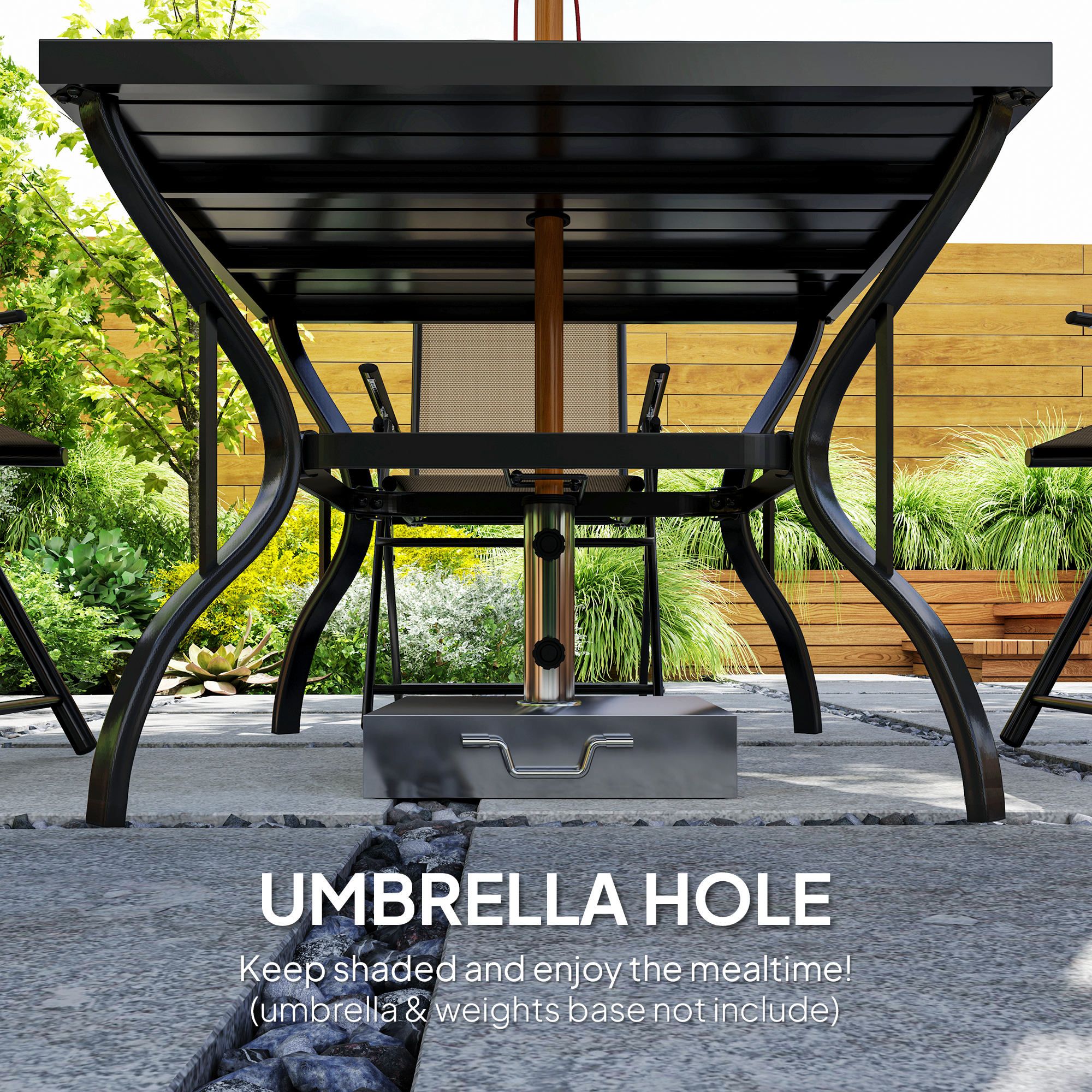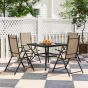 Simple, stylish outdoor dining with this SUNVISTA outdoor dining table and chairs set. It comes with a square dining table and four matching folding chairs: plenty of room for you and company. The powder coated galvanised steel frames mean the patio table and chairs are strong. The folding chairs save space and come with breathable texteline seats for comfort. This outdoor garden furniture set is complete with Φ50mm hole in the table to hold a parasol umbrella in place.