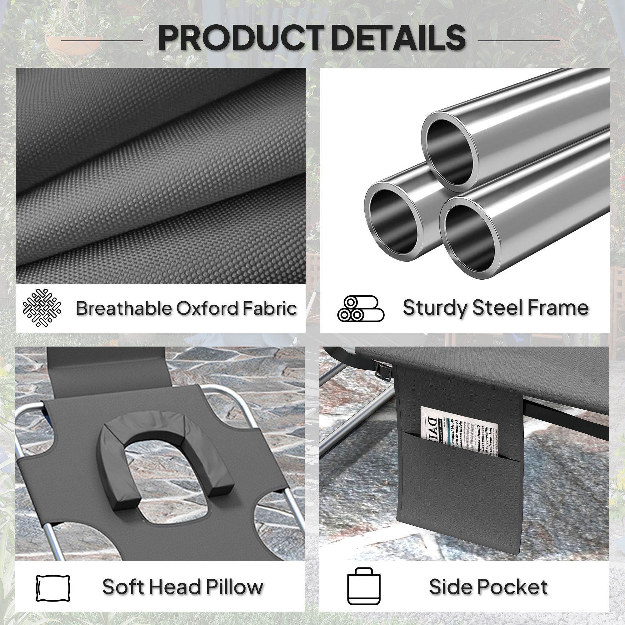 A cool update on the foldable sun lounger from SUNVISTA. Features a padded head hole at the front to allows you to rest your face in comfortably, which is perfect for relaxing or even reading a book! The powder coated steel frame is strong and solid to support up to 120 kg. The reclining backrest is five positions adjustable, easy to set and lock to a position you like best. Complete with a handy side pocket.