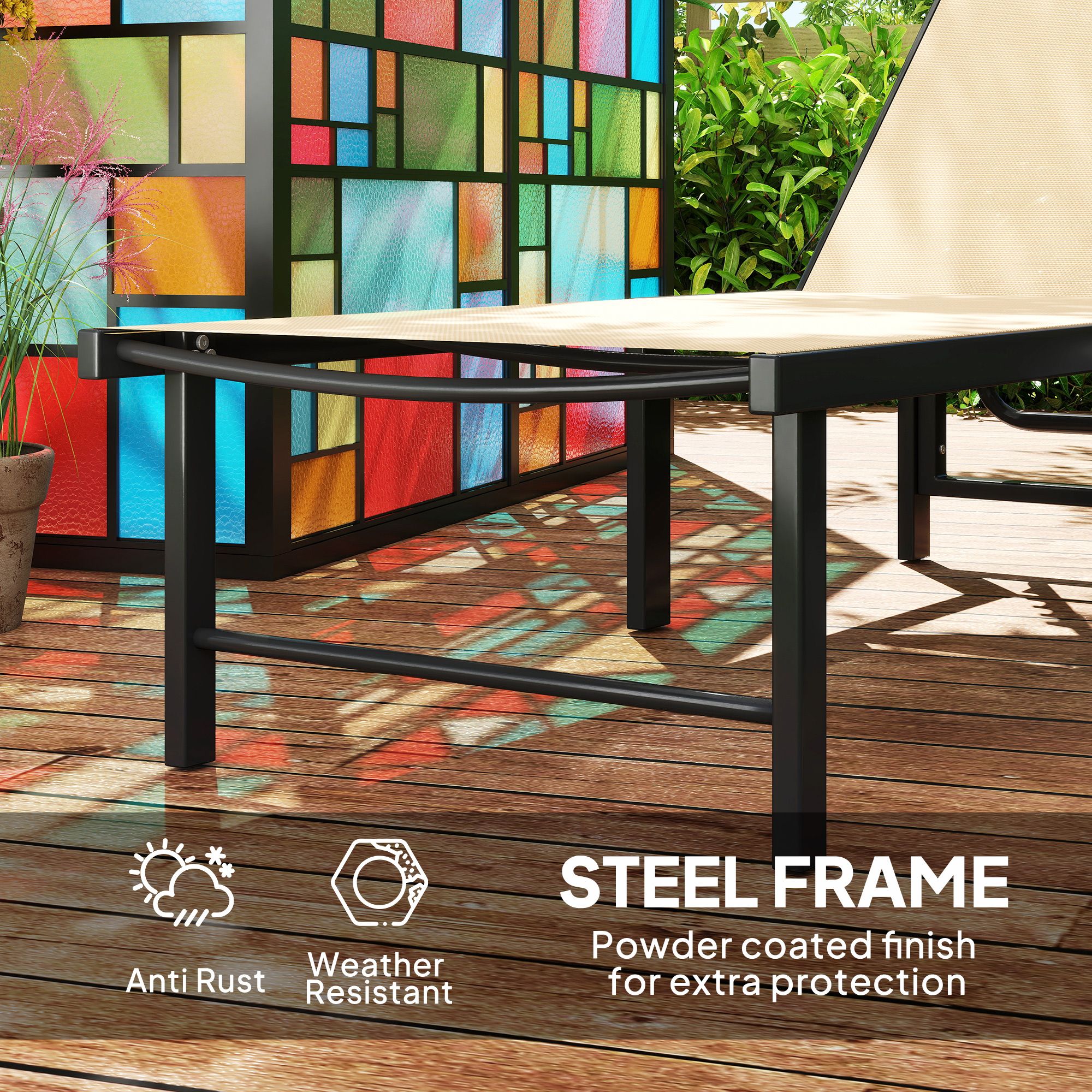 Lay the day away with your favourite person - grab this set of two SUNVISTA garden sun loungers. The backs of these reclining sun loungers can be set to five different positions - lie back to a position you want. The breathable texteline seat panels hold you comfortably and keep you cool. The powder coated steel frames mean a strong, supportive core.