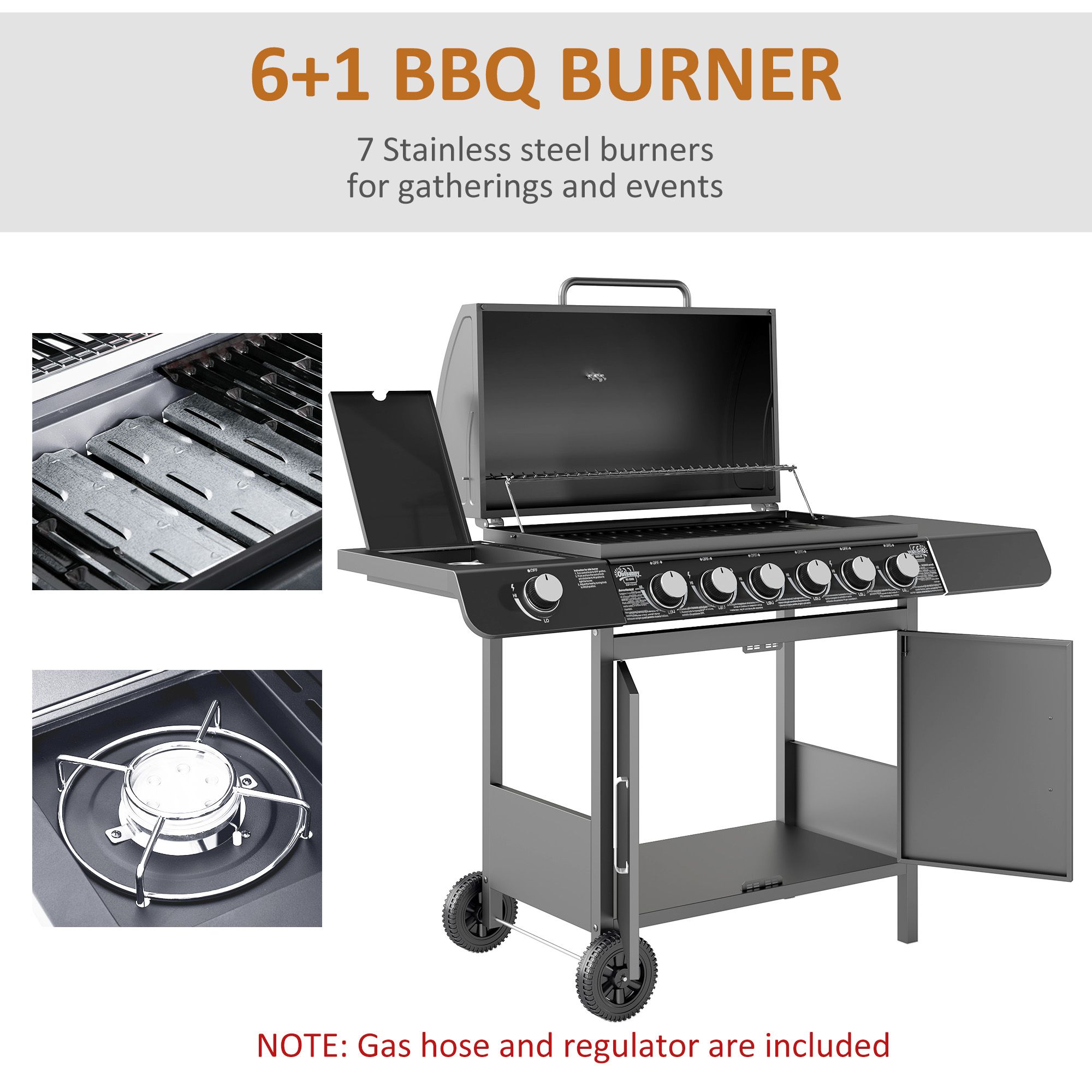 Weight Capacity: Side table: 5kg, Cabinet: 7.5kg, NOTE: Regulator and Hose are Included with the BBQ grill.(pipe size: diameter=8mm, length>0.8m)