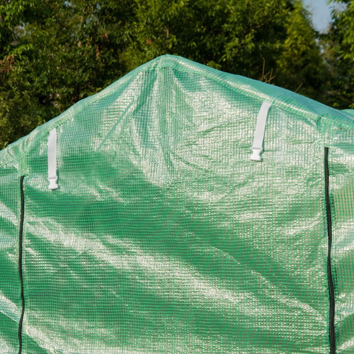This a spacious walk in polytunnel greenhouse helps you create your very own indoor garden. Made from durable steel frame with PE cloth to protect your plants, fruits and vegetables against unsuitable weather. It is created to provide desired temperature, humidity and sunlight to your plants. Roll up windows and zip door allow ease of access and optimum protection from birds and pests.