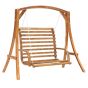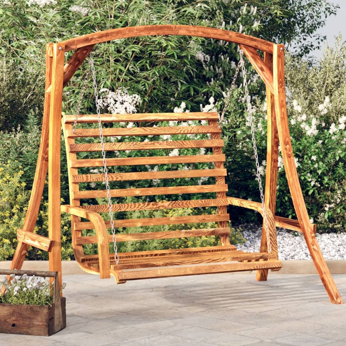 This wooden swing bench is the perfect choice if you're looking for relaxation and enjoyment in outdoor spaces. Solid spruce wood frame: This hanging bench is made of solid spruce wood. Solid spruce wood is a lightweight, stable, rot-resistant softwood. It has a fine, even texture, and a consistently straight grain. The teak finish gives it a dark wood look.Ergonomic backrest and armrests: The backrest and armrests of the garden swing bench are ergonomically designed, bringing you optimum comfort while sitting.Soothing rocking motion: Relax by sitting comfortably while enjoying a calming, gentle rocking motion. Good to know:The wood is a natural product and can show imperfections.