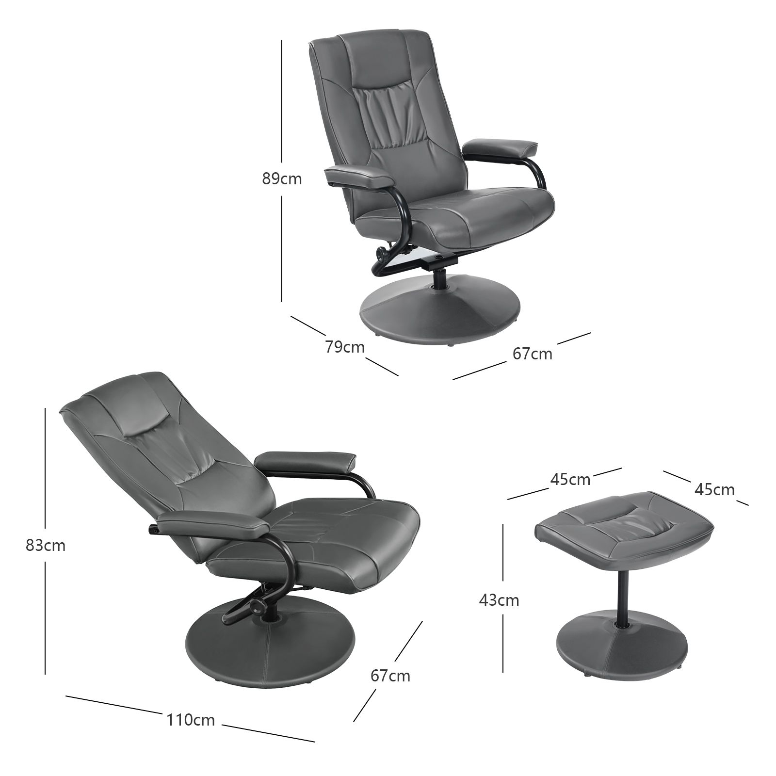 Colour: Black/Brown/Grey Materials: PVC, PU, Metal Dimension of Chair: 67 x 79-110 x 83-89 cm (L x W x H) Dimension of Ottoman: 45 x 40 x 43 cm (L x W x H) Seat Height: 49 cm