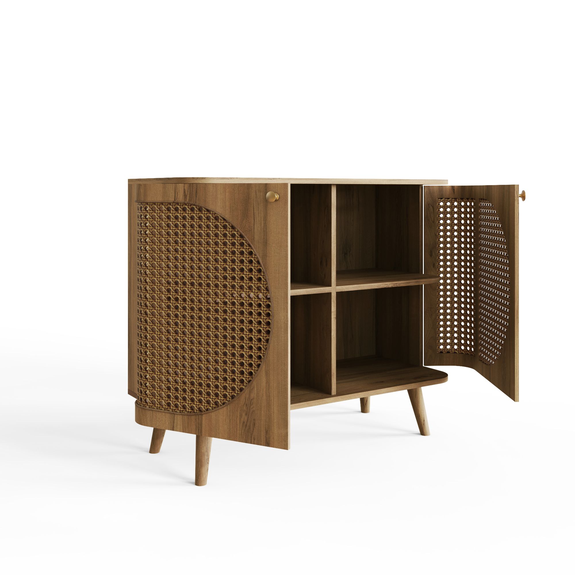 The SYLVANl Rattan Compact Sideboard is a stylish two-door design that combines natural texture with everyday practicality. Its rattan-fronted doors open to reveal shelving, offering flexible storage for hallways, bedrooms, or dining areas. The smooth curved edges and subtle brass-effect details add a touch of elegance, while the oak frame brings warmth and character to your home. Ideal for smaller spaces, this compact sideboard delivers both function and effortless style in one timeless piece.
