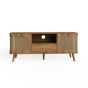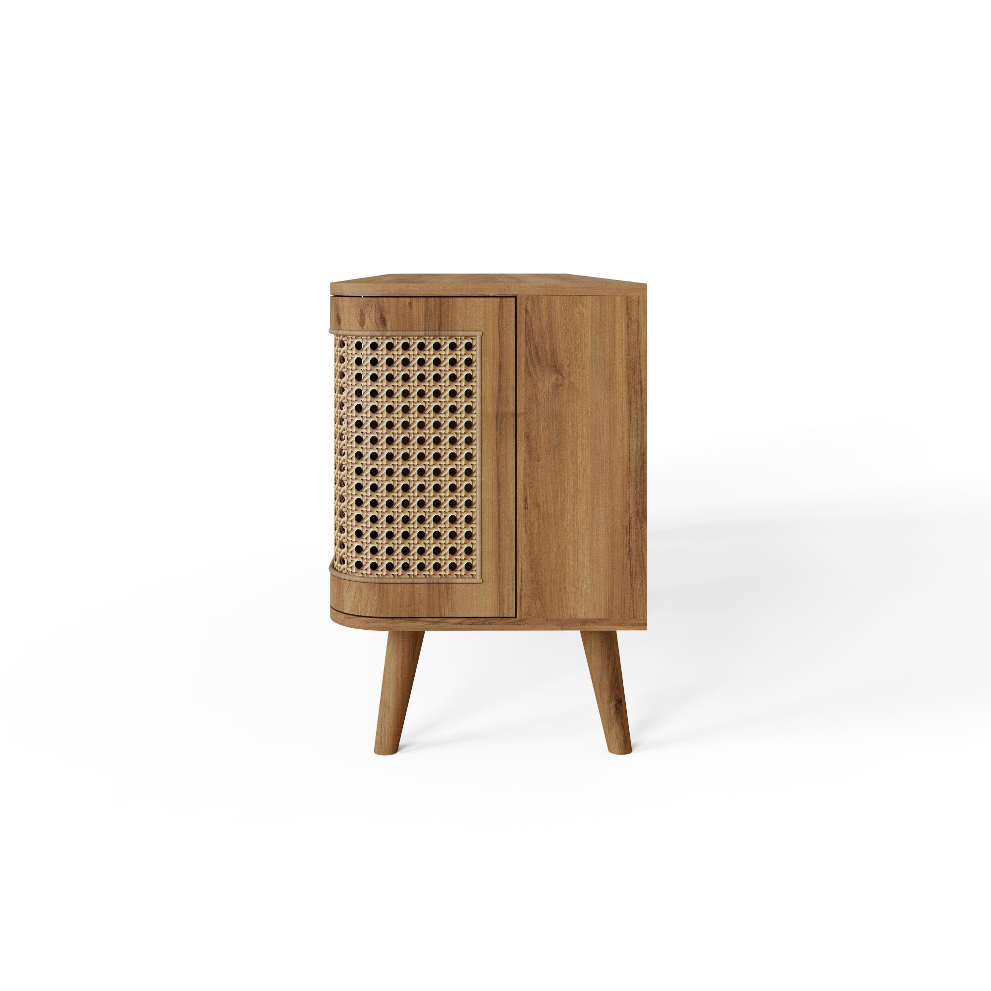 The SYLVANl Rattan TV Unit combines modern functionality with the charm of handcrafted design. Ideal for contemporary living rooms, it features spacious shelves for media equipment and concealed cupboards with woven rattan fronts for a naturally textured finish. The smooth curved edges and brass-effect handle add a refined touch, while the raised legs create a light and open feel. Perfect for keeping your space tidy and beautifully styled, this oak TV unit blends seamlessly with both classic and modern decor.