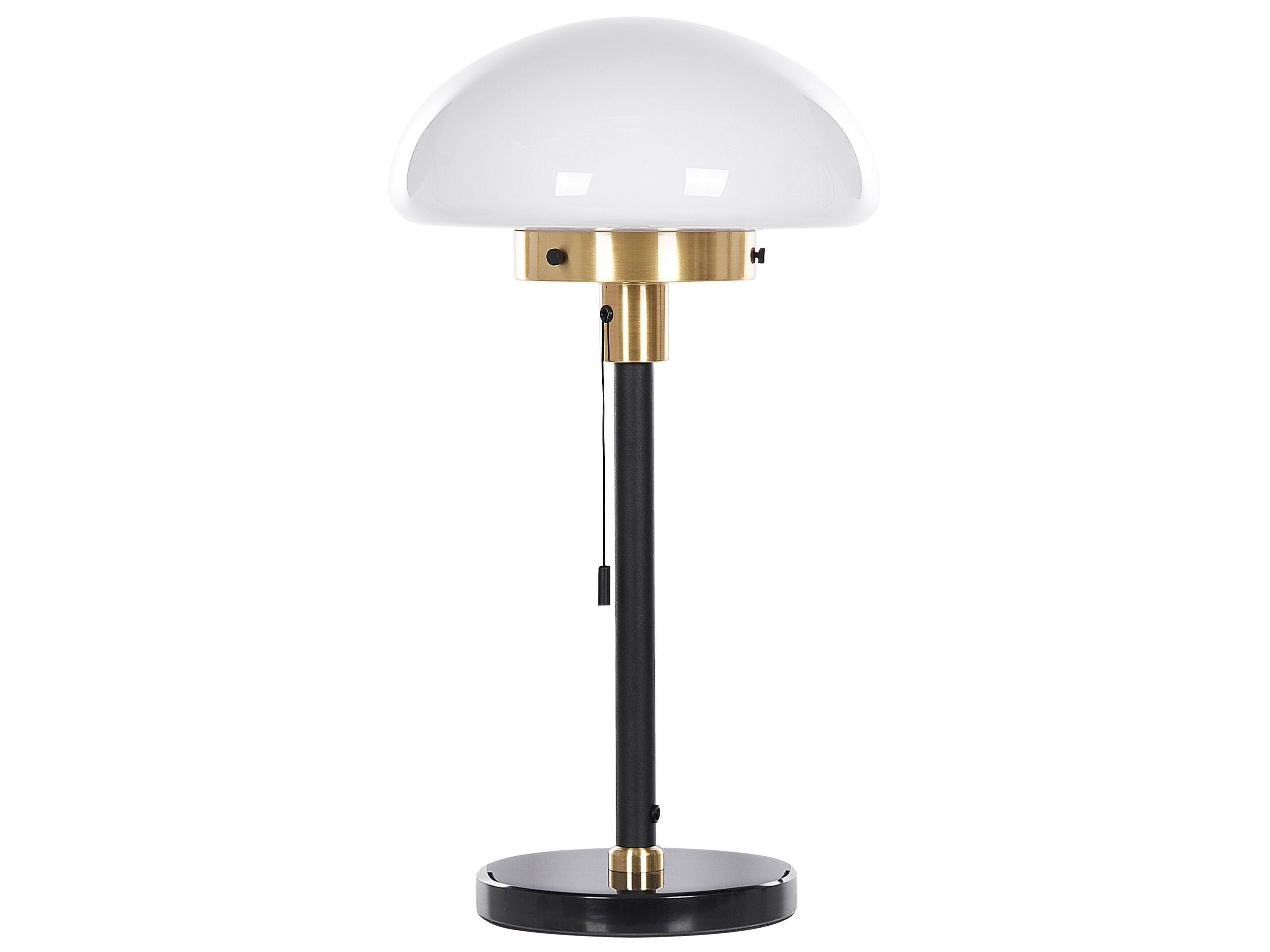 Adorn your interior with a decorative table lamp that thanks to its classic, retro-inspired design nicely complements areas in various styles. Gold-coloured elements and a pull switch add a sophisticated touch, which in composition with half globe, glass shade creates a vintage feel. Place this piece on a side table or next to your bed and enjoy its nice, ambient light whenever it gets dark outside. Details: Color: Black, White, Gold. Main material: Iron. Additional material: Glass. Weight: 4 Assembly: Partial Assembly Required