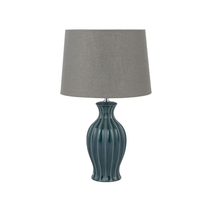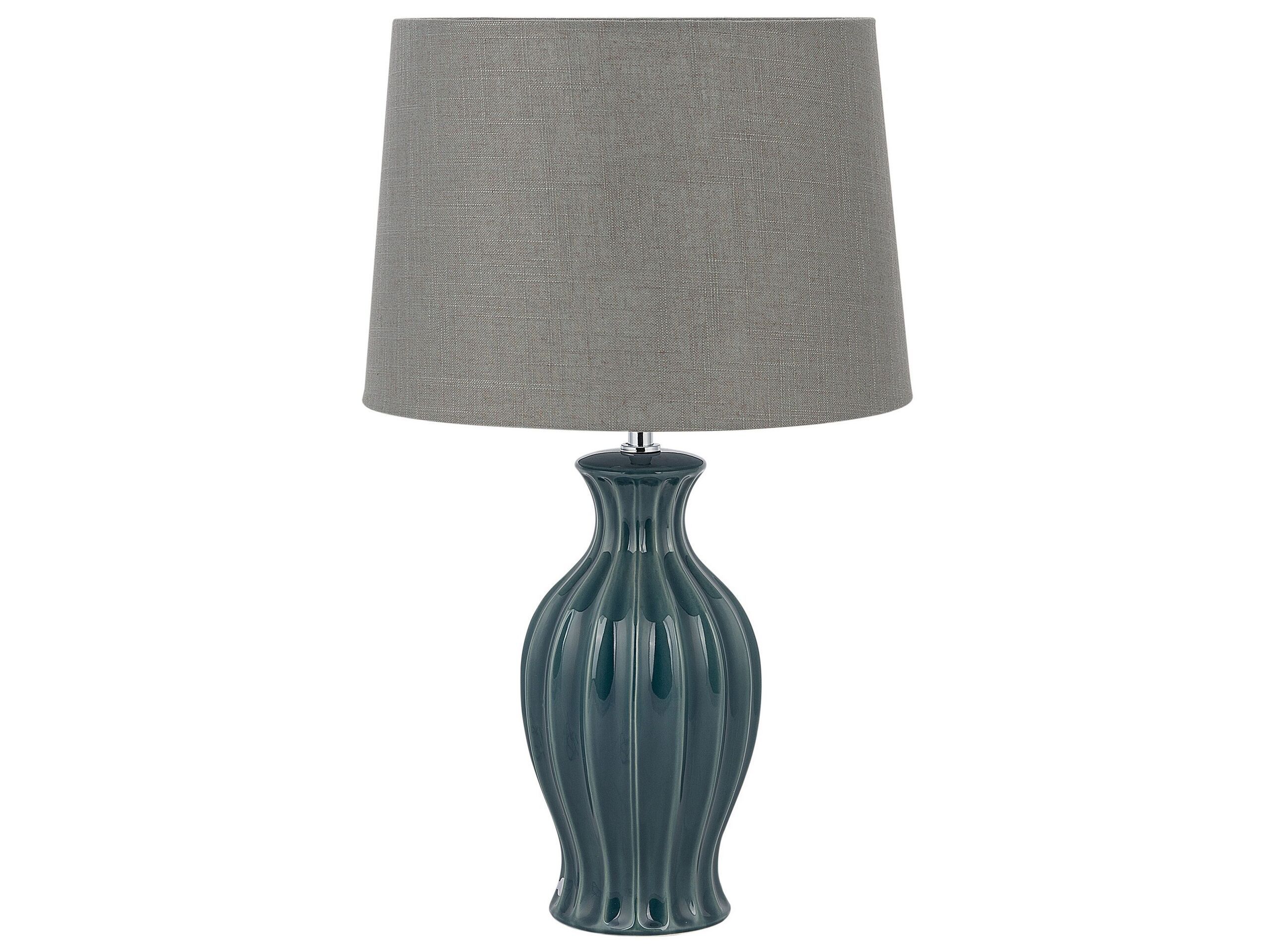 Classically designed, this ambient table lamp adds an elegant touch to any room, from living area or bedroom to a home office. Featuring a textured ceramic base in tonal green that contrasts nicely with the simple, drum shade made from polyester. Thanks to the grey colour, the shade emits a subtle, pleasant light. Details: Color: Grey, Green. Main material: Ceramic. Additional material: Polyester. Material Composition: 100% Polyester Weight: 3 Assembly: Partial Assembly Required