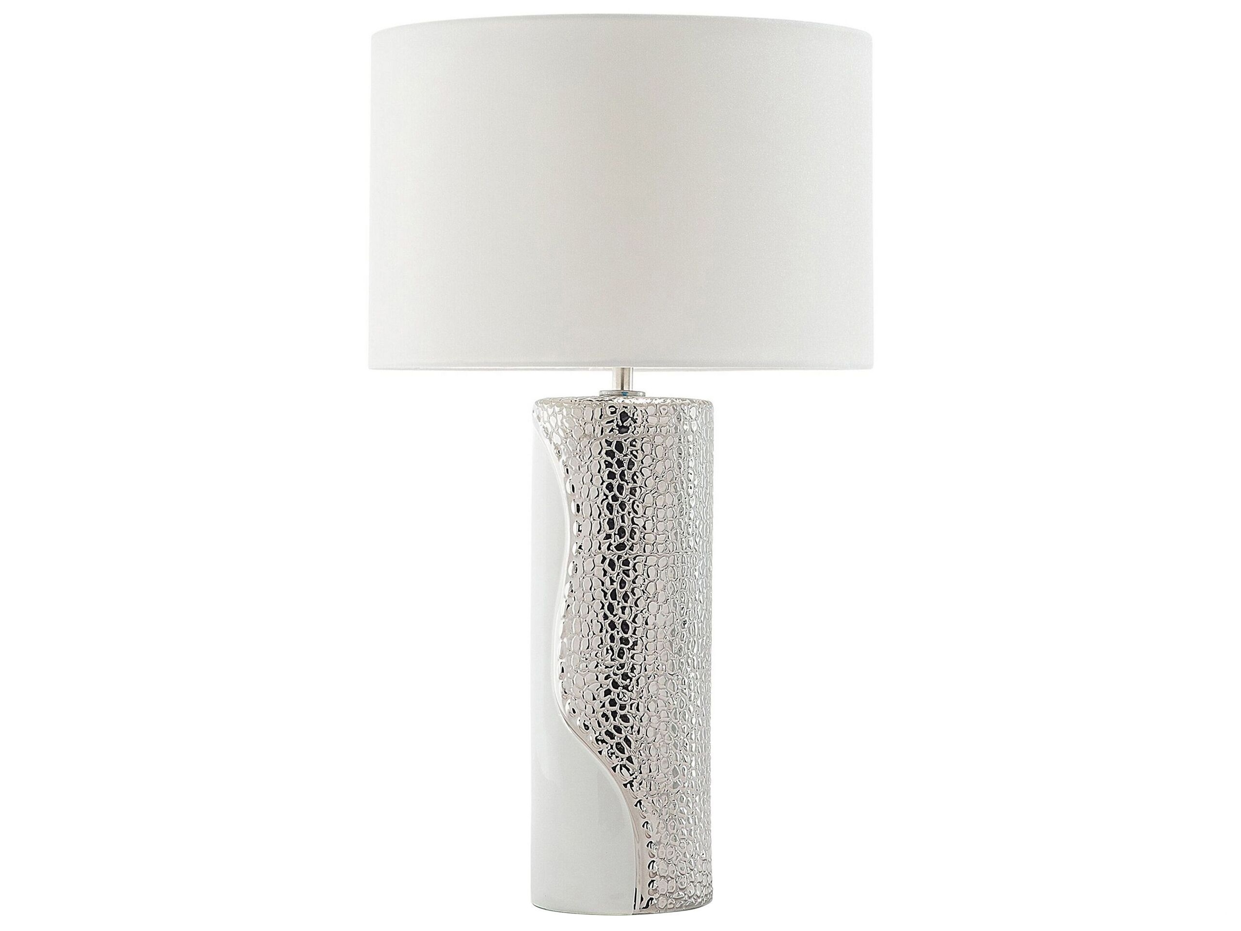 An elegant table lamp that brings a classic presence to your home decor. The drum shaped lampshade sits on top of a porcelain, two-coloured pillar base. The fabric shade diffuses the light giving an ambient, calm lighting. This table lamp adds an impressive touch to any living room, bedroom, dining room, hallway, or home office Details: Color: White, Silver. Main material: Porcelain. Additional material: Faux Silk. Material Composition: 100% Faux Silk Weight: 3 Assembly: Partial Assembly Required