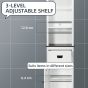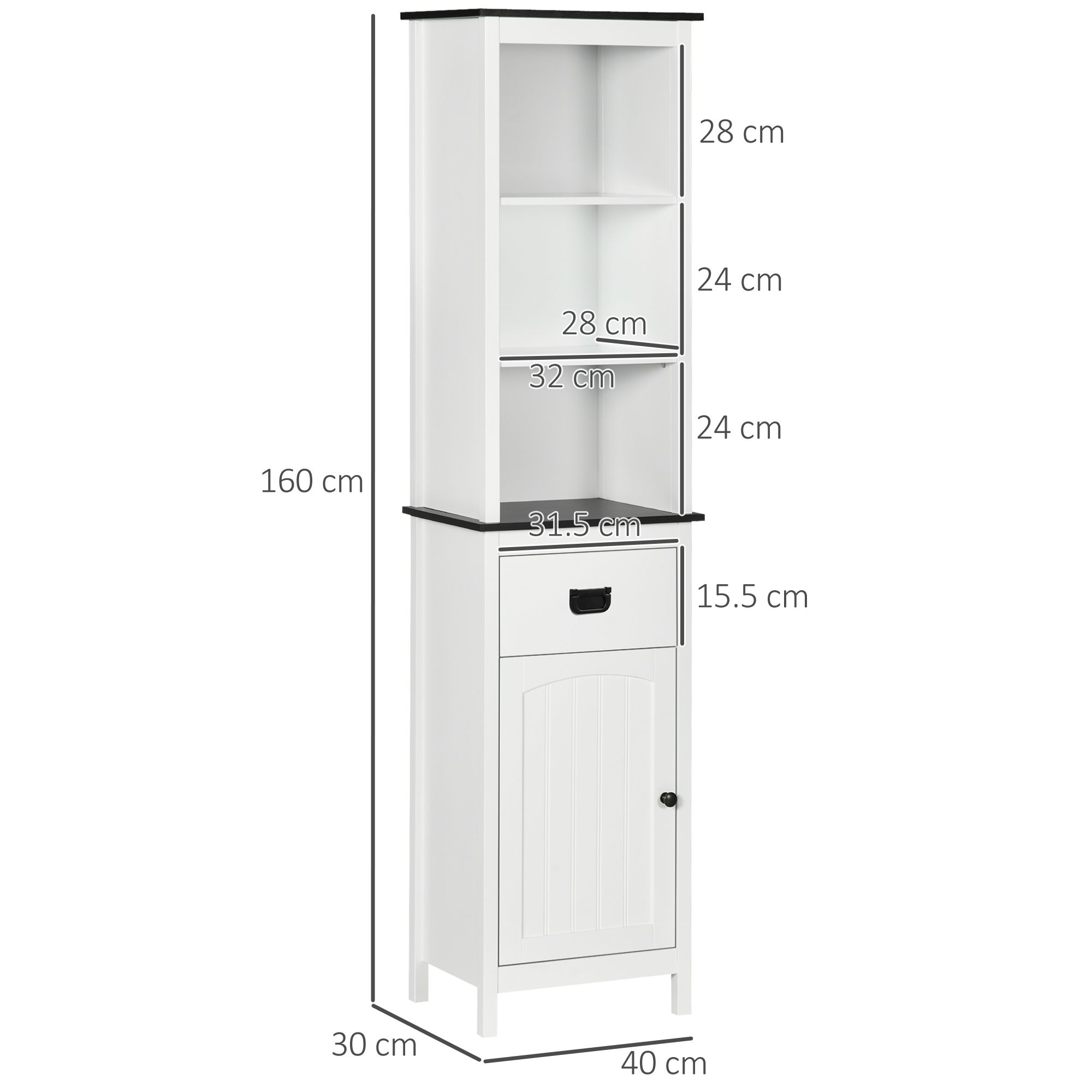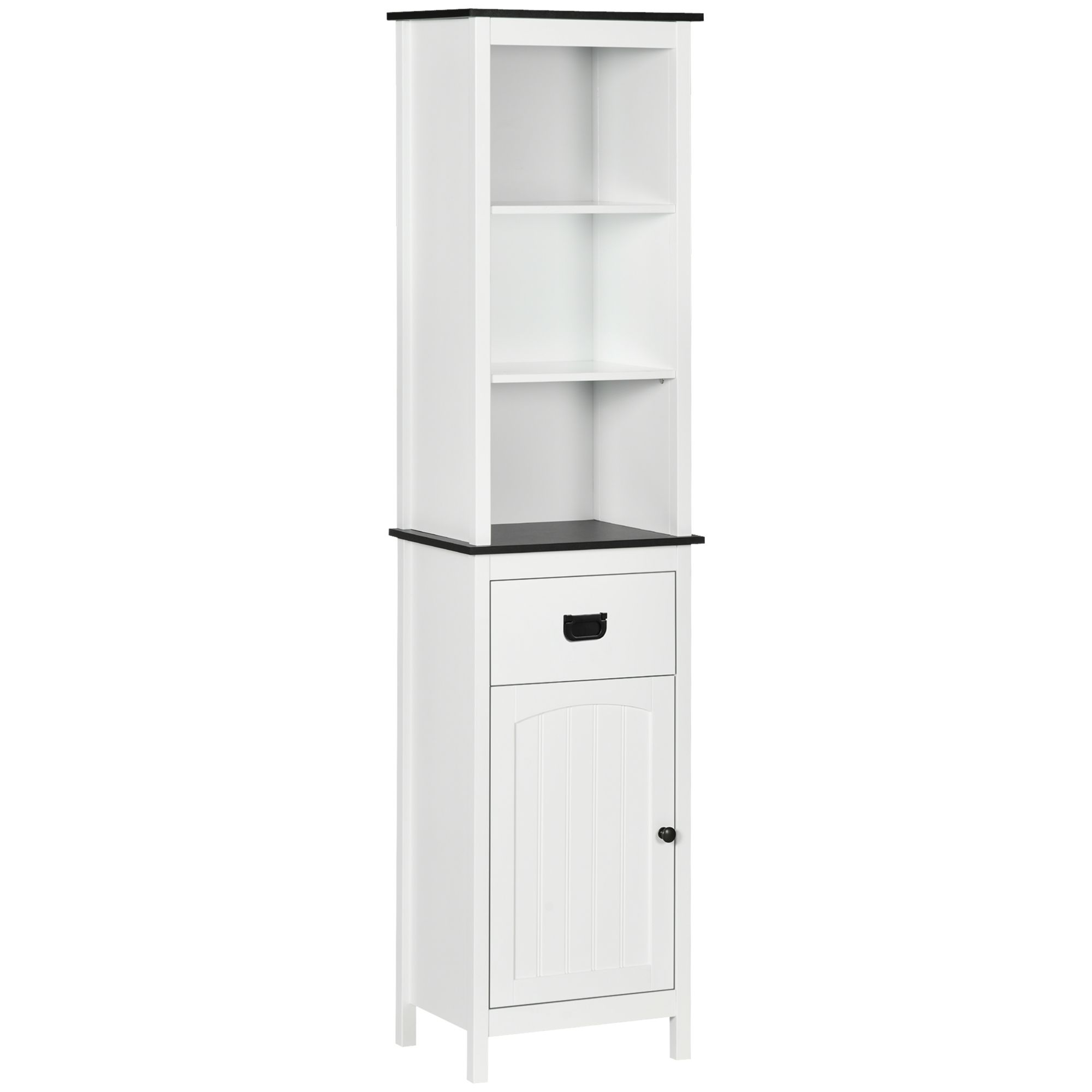 - Storage: Tall bathroom cabinet comes with three top shelves, drawer and bottom cupboard. A bathroom storage unit which offers plenty of room for toiletries, essentials and more. Adjustable shelf in upper space and inside cupboard.