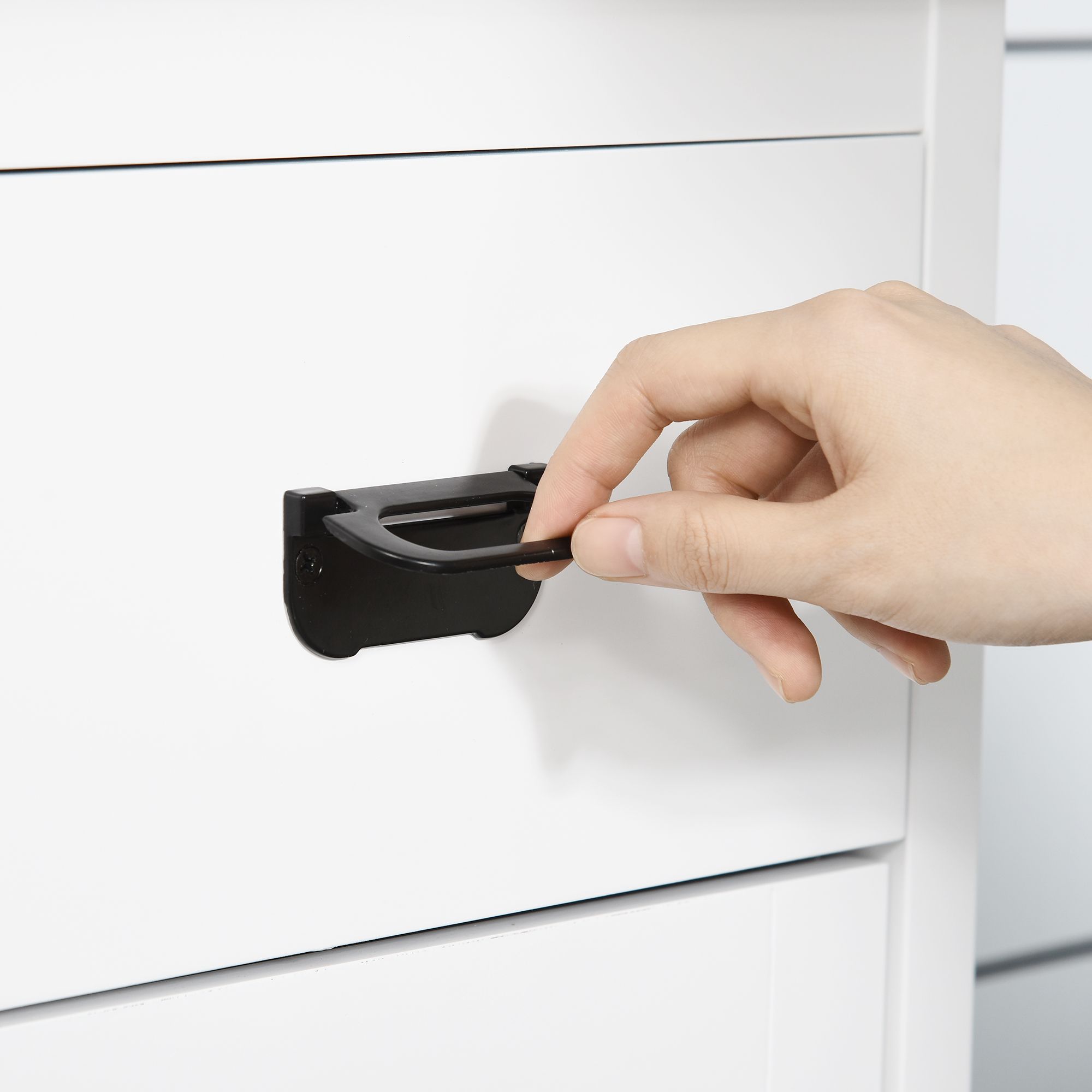 - Modern tallboy design, in a fresh white finish with black accents. Small feet to elevate