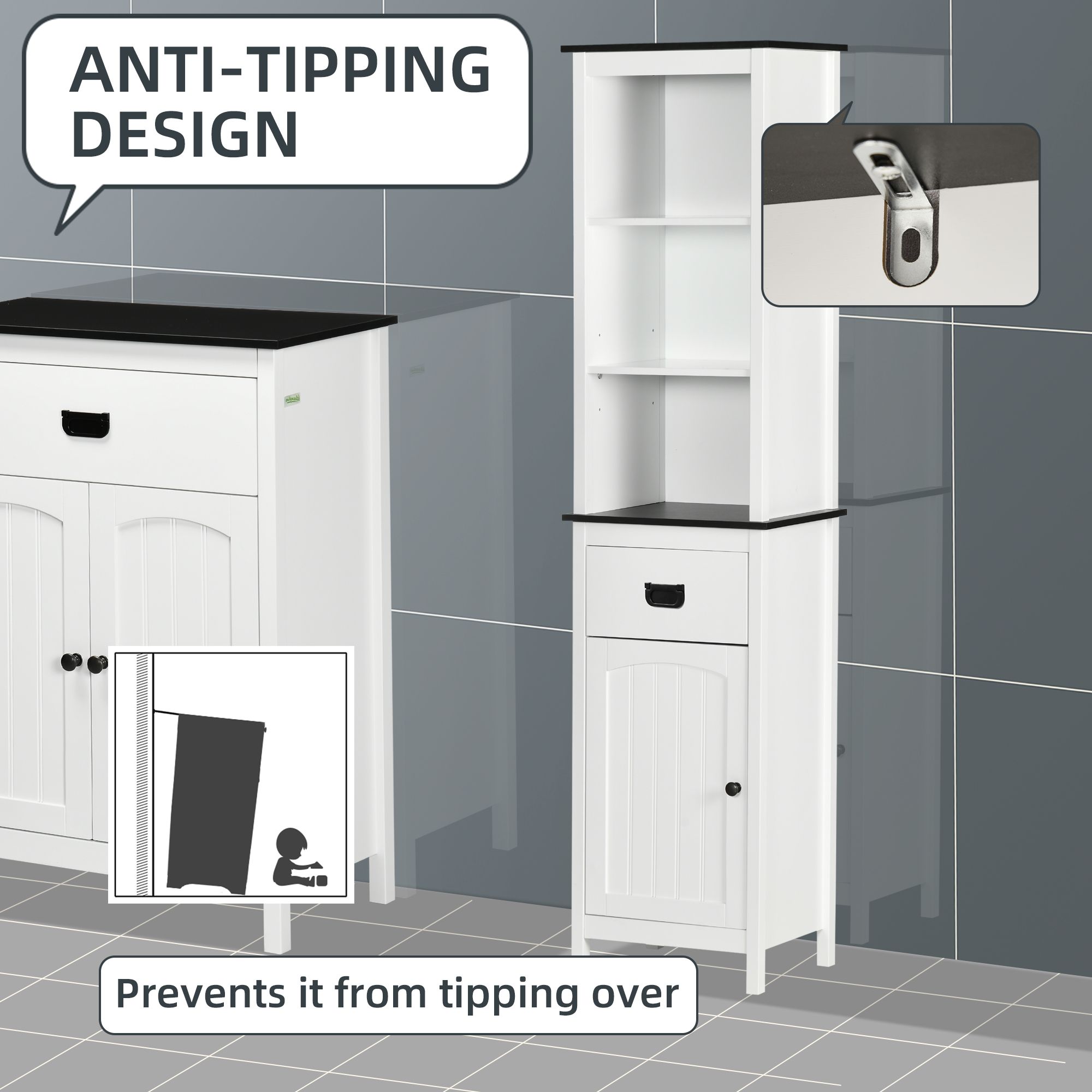 - Anti-tipping straps: Attach this freestanding bathroom cabinet safely to your wall.