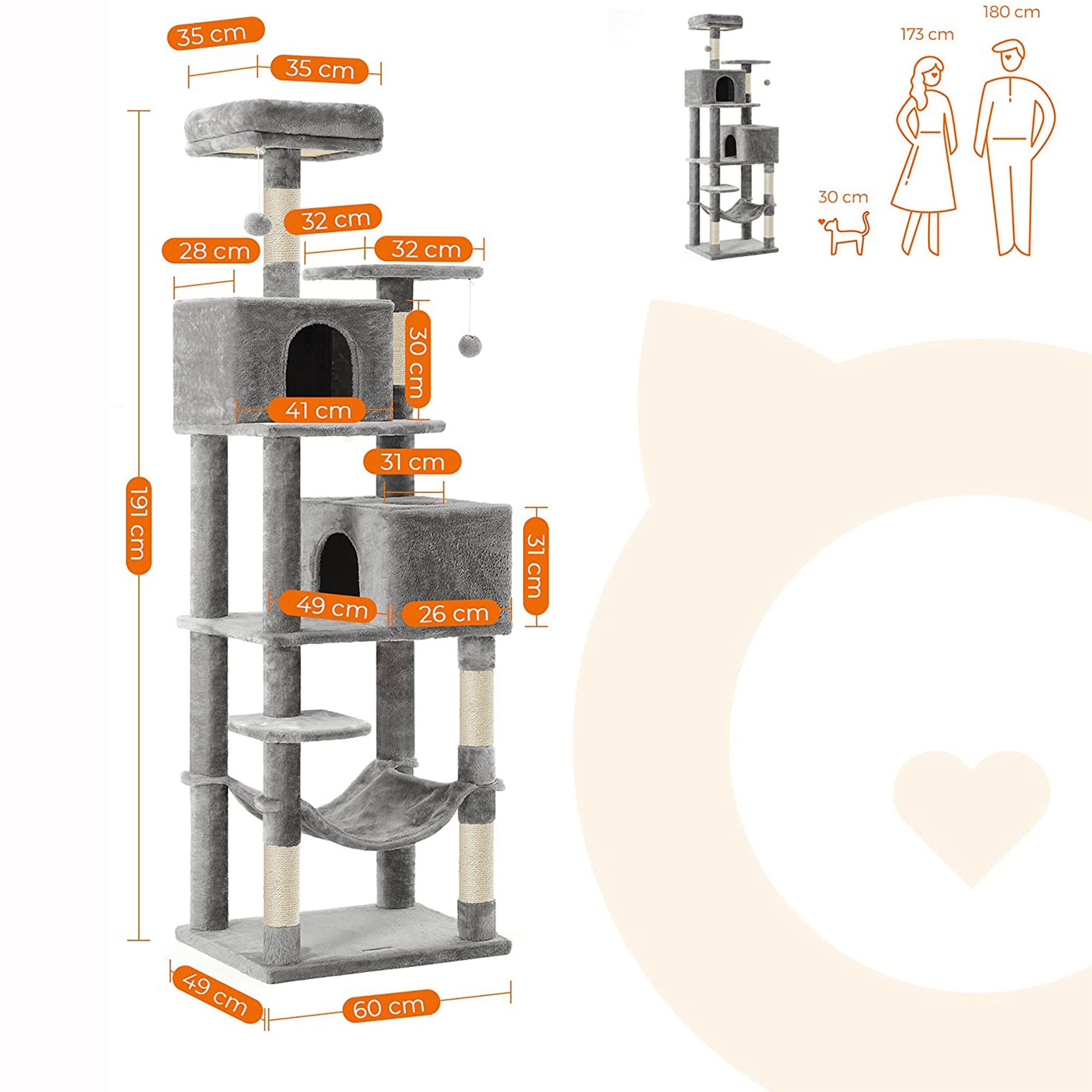 Inside the creative workshop of FEANDREA, two sweet kittens jump around, personally examining our cat trees and giving their animal feedback. Thus, the designers of FEANDREA get to know firsthand whether the products meet the requirements of pampered whisker wearers. The highlights of the cat tree at a glance: - Soft and durable plush surface. - The top perch is well padded and equipped with comfy raised edges. - 2 comfortable caves for sleeping and hiding. - 1 soft hammock for relaxing times. - Sisal-wrapped scratching posts to sharpen their claws.