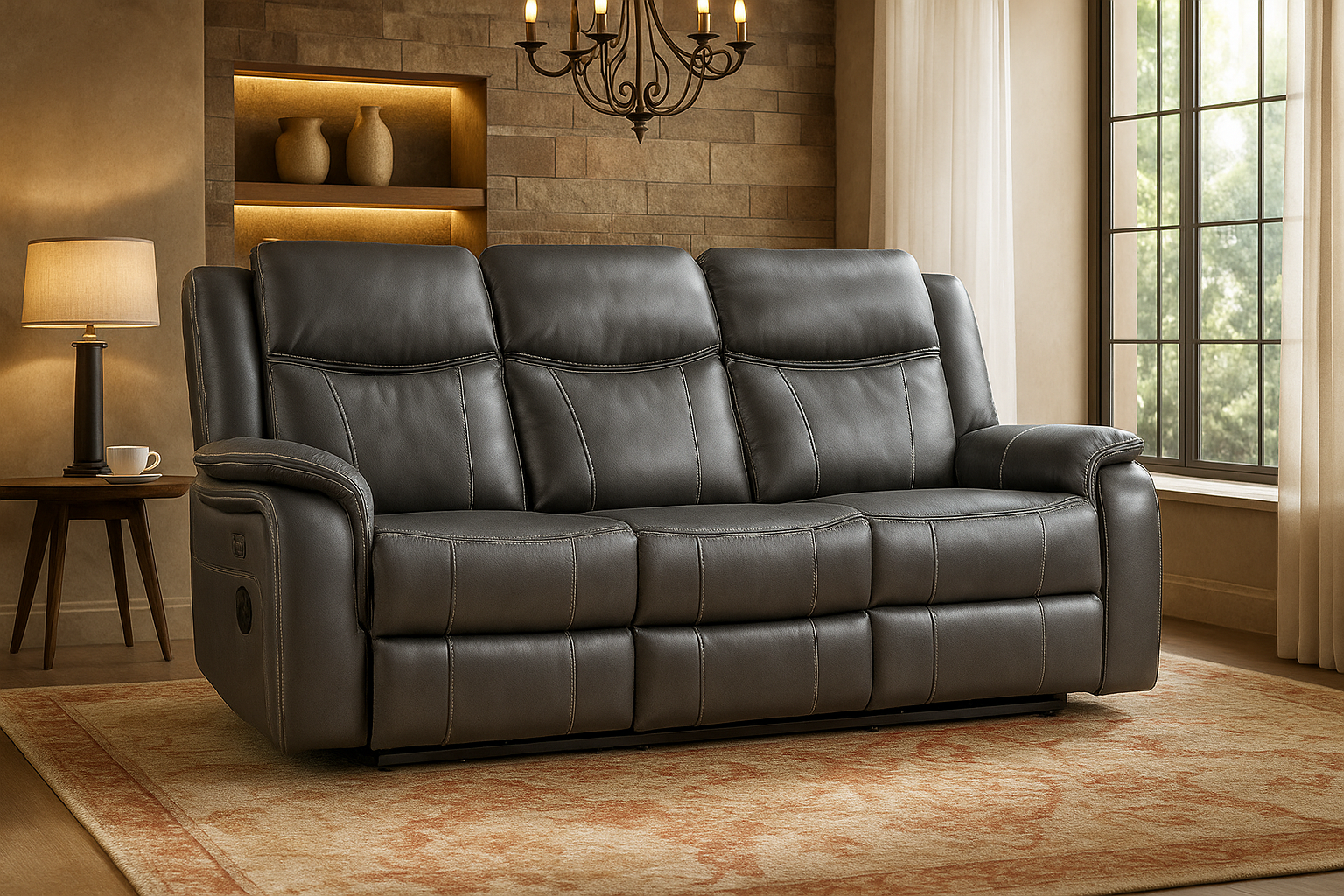 TechLuxe 3-Seater Dark Grey Leather Recliner offers luxurious comfort with premium leather and a sturdy metal frame. Spacious and easy to maintain, it’s perfect for modern lounges. Also available in black leather and 2-seater. Its smooth reclining mechanism and plush padding provide exceptional support, while the durable leather adds sophistication. Ideal for family rooms or entertainment spaces, this sofa blends contemporary elegance with lasting durability for everyday luxury.