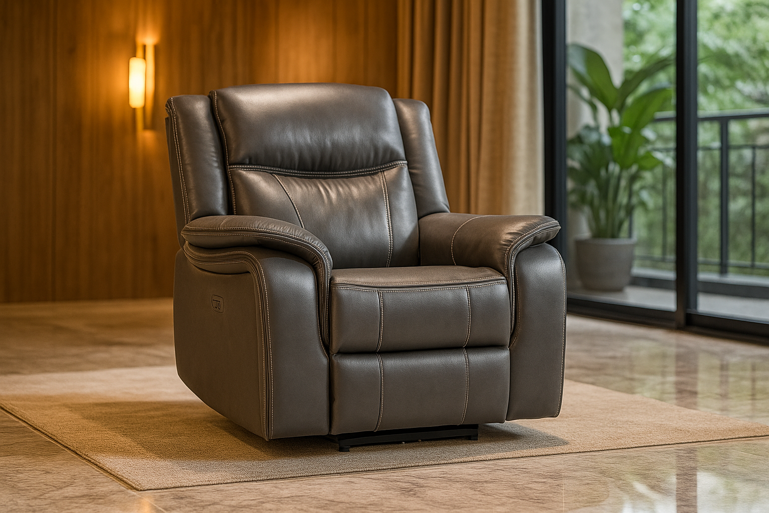 TechLuxe Recliner Armchair in dark grey leather offers elegant comfort with plush padding and a sturdy frame. Compact and easy to maintain, it’s perfect for any room. Also available in black leather. Its smooth reclining mechanism and soft cushioning ensure exceptional relaxation, while the premium leather adds sophistication. Ideal for living rooms, bedrooms, or home theatres, this armchair blends modern style with durability for daily comfort.