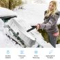 The roof snow rake helps you remove snow quicker and safer. You can twist the height lock to adjust the height of the pole, and reach farther places overhead just standing on the ground. You don’t worry the rake head will hurt you because its smooth angles. And the blade or head of this rake is large so that it can hold more snow at one time, you can clean up the roof almost using no time. In terms of storage, in snowy days, you can save space by shortening height of the rake and putting it in a corner. In warming days, just disassemble it and put it box. Bullet Point:Telescopic Snow Shovel: Twist-n-Lockdesign on the pole allows you to adjust the height from 6.2ft to 21ft. You can reach farther by standing on the ground and clean up roof without climbing it at risk of injured with the snow rake.Sturdy and Durable Construction: Between the pole and the head of this rake has triangular structure make the connection more stable. Meanwhile, we use corrosion-resistant aluminum to cast the snow rake. In a word, it will be used for a long time.Easy to Handle: Having 5lbs of weight and non-slip handle, the rake which is constructed with light aluminum tube and plastic parts, for you to maneuver and control more easily. Large Poly Blade: Measuring 25" × 6" inches, it scoops away large amount of snow at one time,so you can get cleanup done in no time at all.Saving Space: Assembled snow rake itself does not occupy too much space because the telescopic pole making it storable in whatever small spaces. And if you want to save more, it’s also easy to disassemble and put parts in a box during snow-free days.