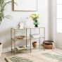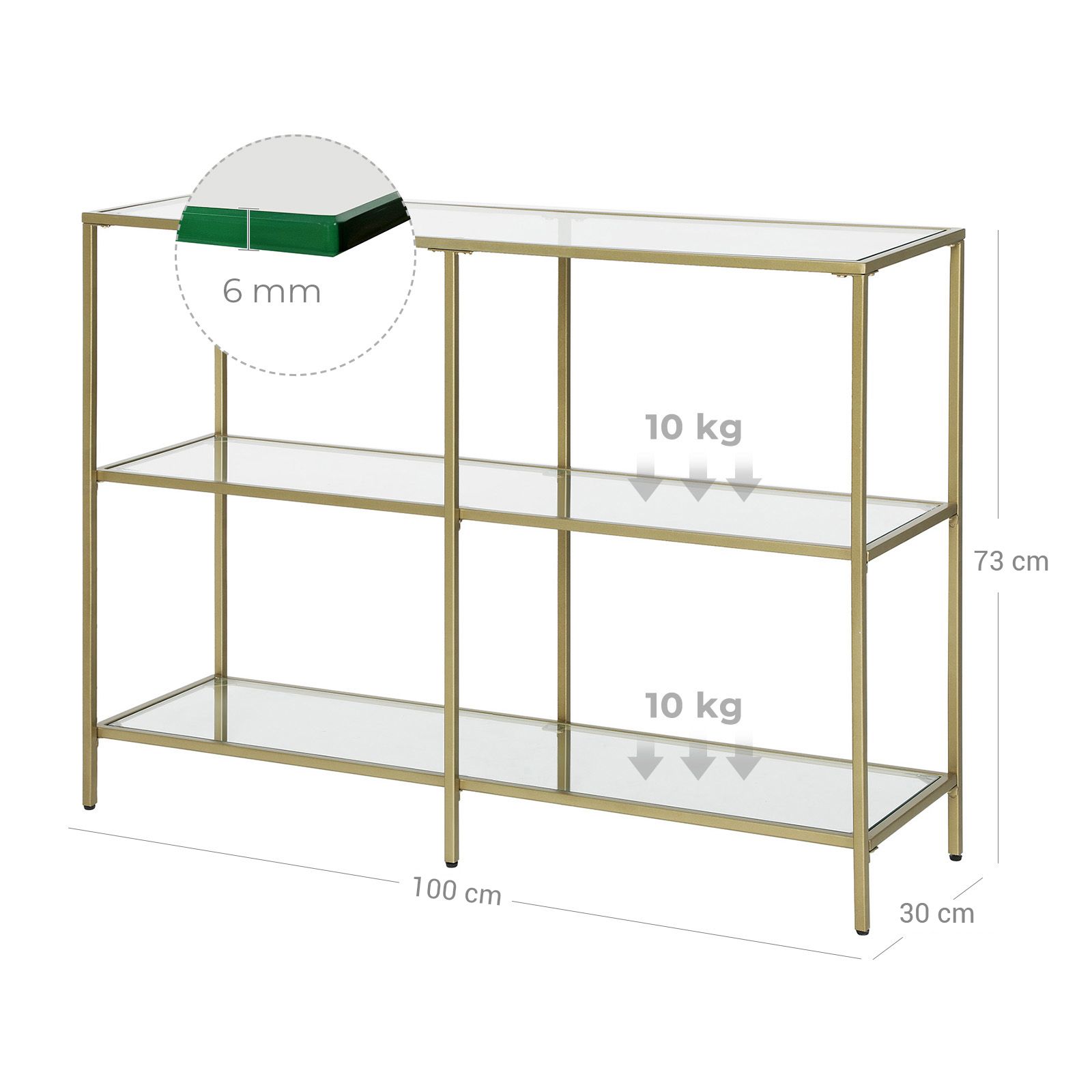 A Modern Look Glass is modern, luxurious, and simple. Combine that with the look of golden-coloured metal and you get a console table with style and practicality in one. Add it to your living room, hallway, entryway, or kitchen for an unforgettably sleek look. Resistant Glass This sofa table uses tempered glass that has been processed for strength. Paired with the metal frame and adjustable feet, it's stable and capable of holding up to 10 kg per shelf (max. static load capacity). Go ahead and fill it up with books—it has you covered!