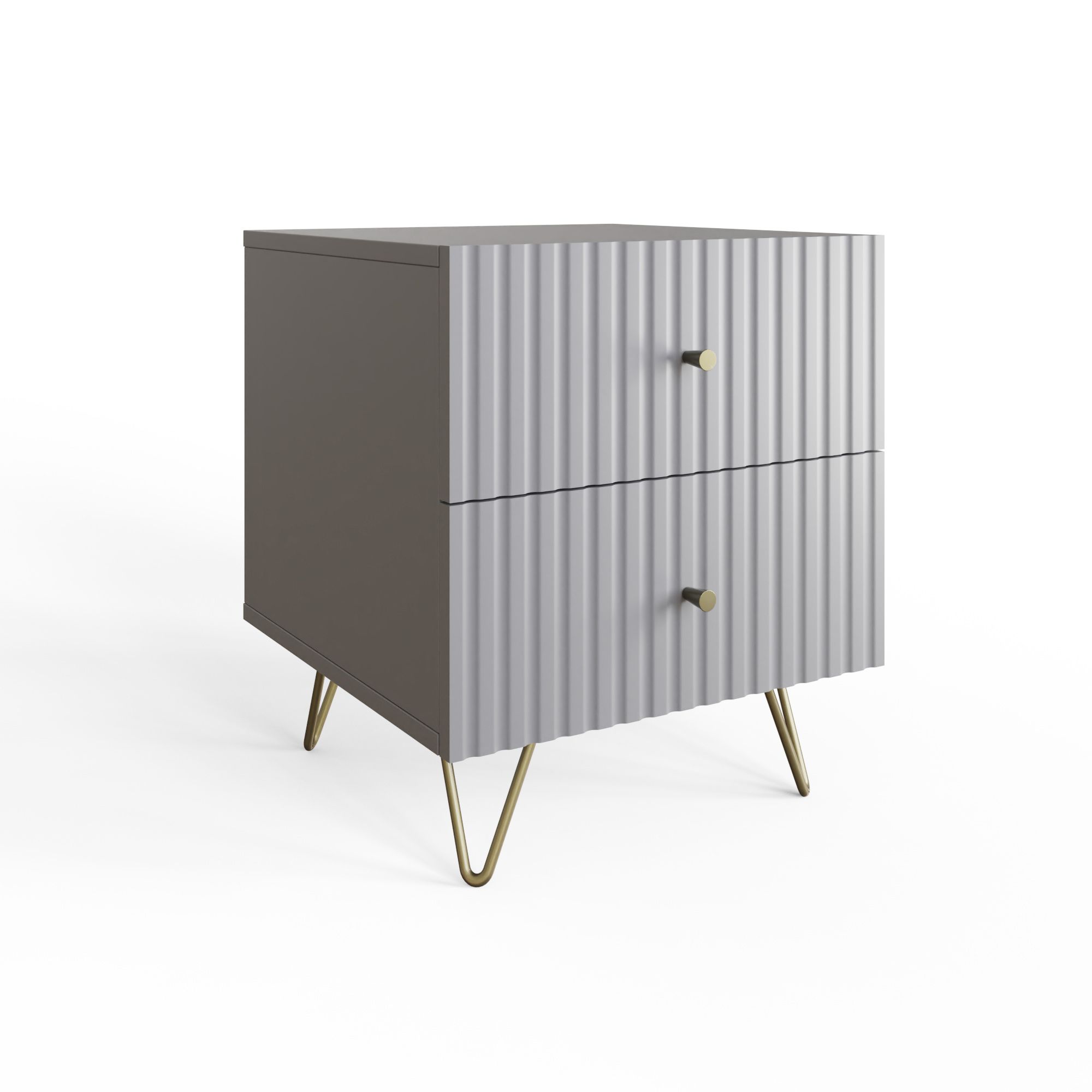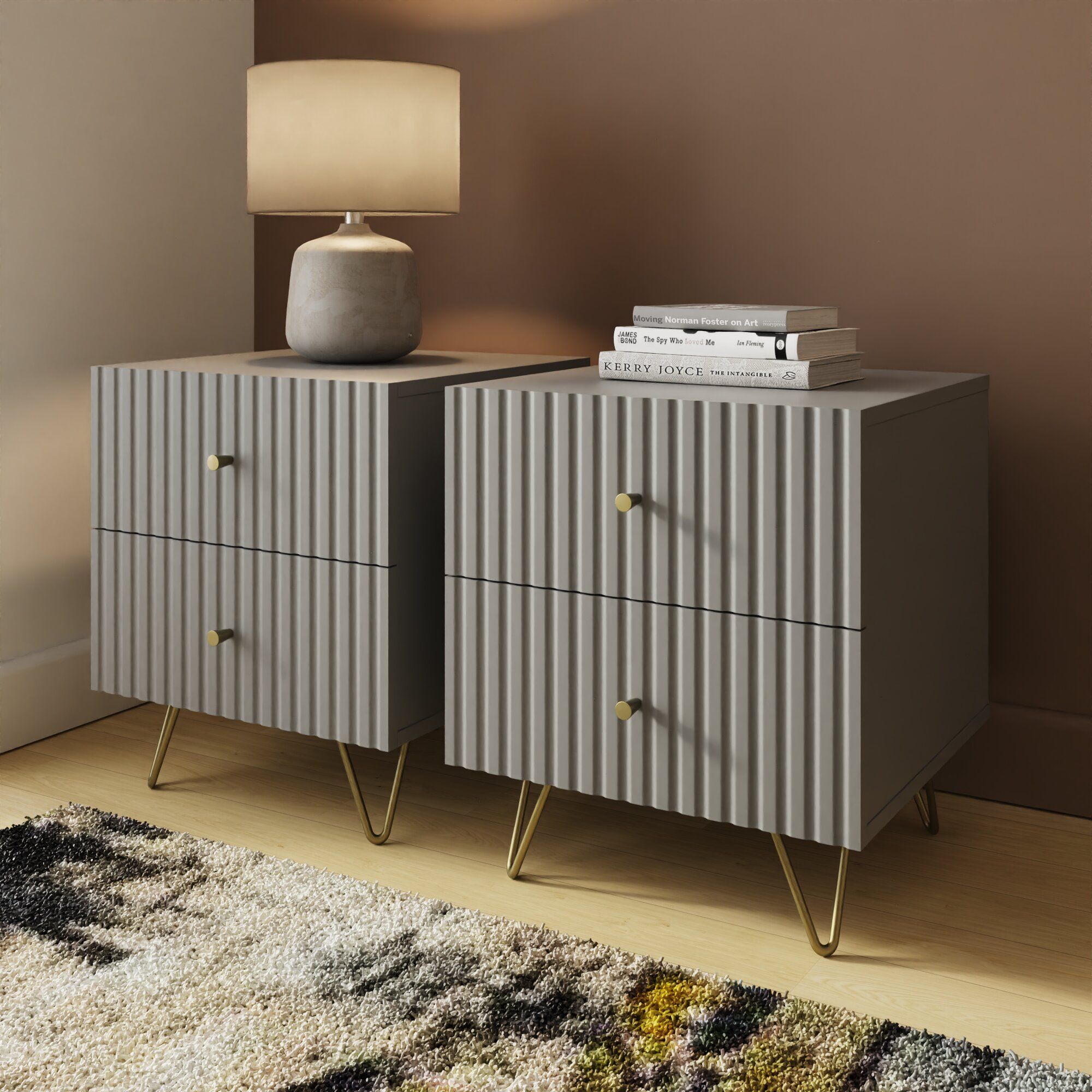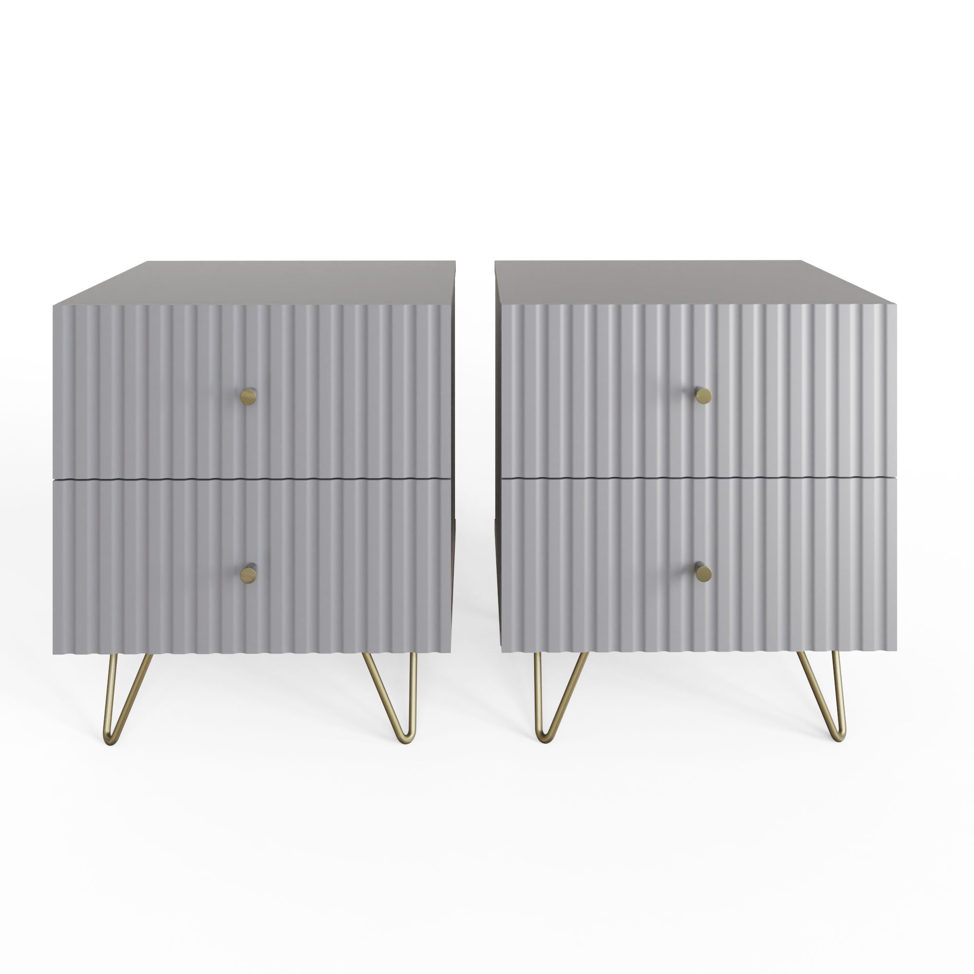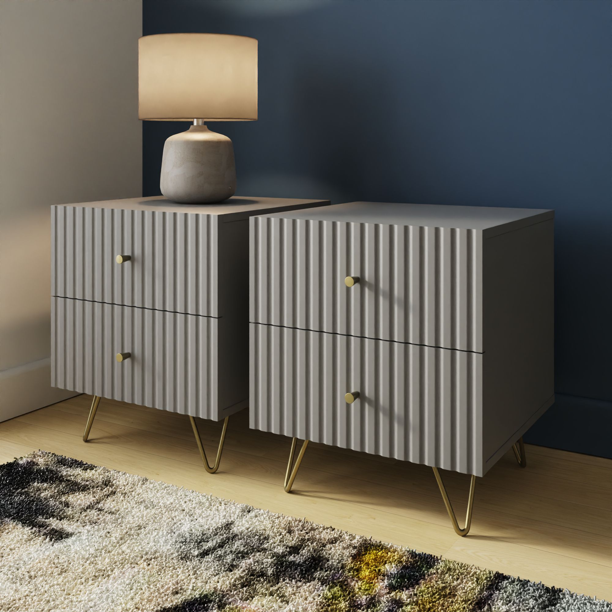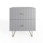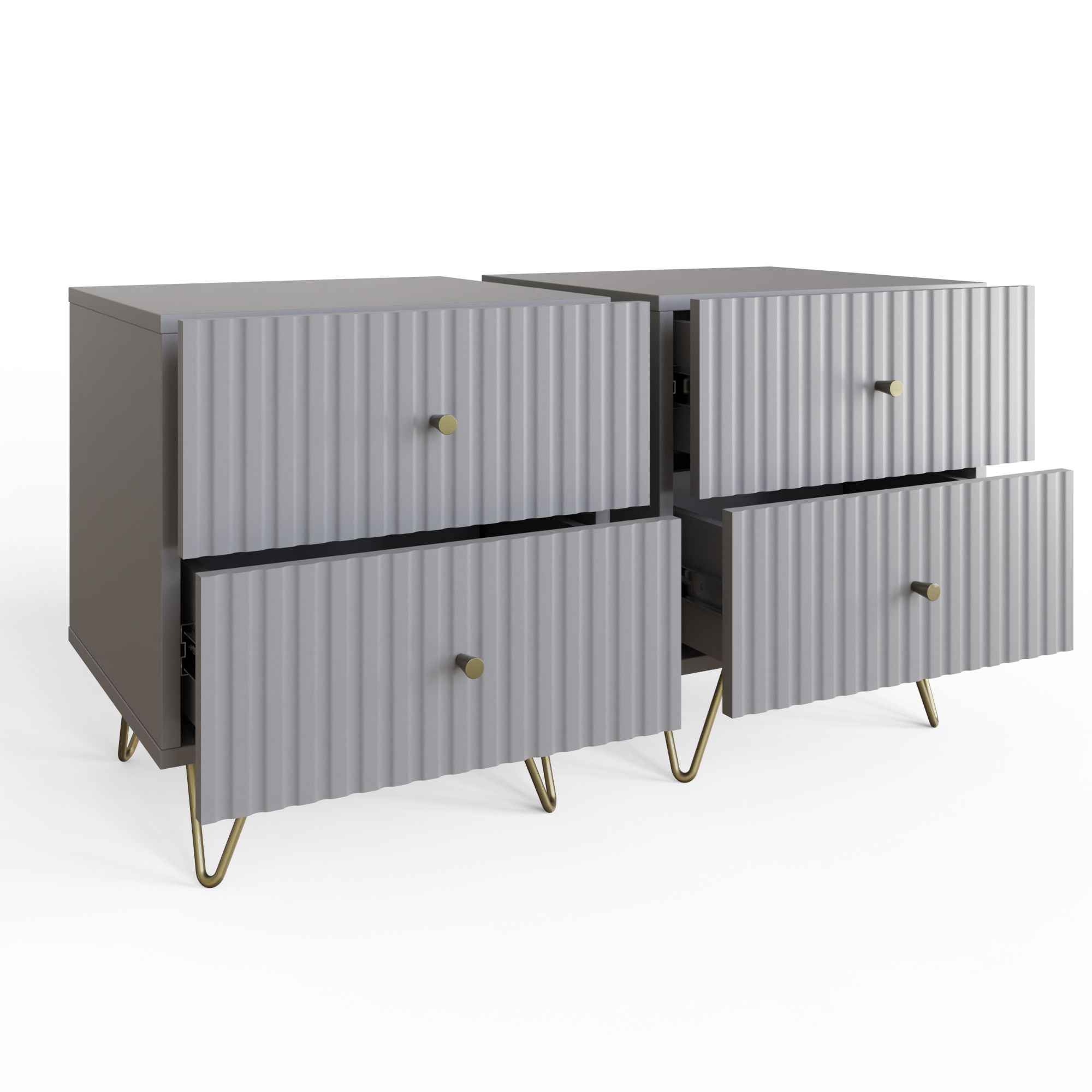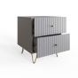 The THARO Bedside Table Pair features a sleek grey finish and a fluted front for a modern touch. With two spacious drawers in each nightstand and sturdy legs for durability, this stylish pair offers both elegance and practical storage.