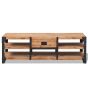This full set of living room furniture, consisting of 1 TV stand, 1 coffee table and 1 console table, is both stylish and practical. The wooden set will add a touch of cool, industrial style to your living room. This sturdy and durable set has been expertly crafted from 100% solid acacia wood with a brushed finish and high-quality steel. The TV cabinet has sufficient storage space to keep your DVD player, game console, remote controls, and other knick-knacks organised and within reach. The solid tabletops of the coffee table and console table are ideal for displaying decorative objects, photo frames, or potted plants. The console table has a shelf which provides additional space for keeping small items. Assembly is easy.