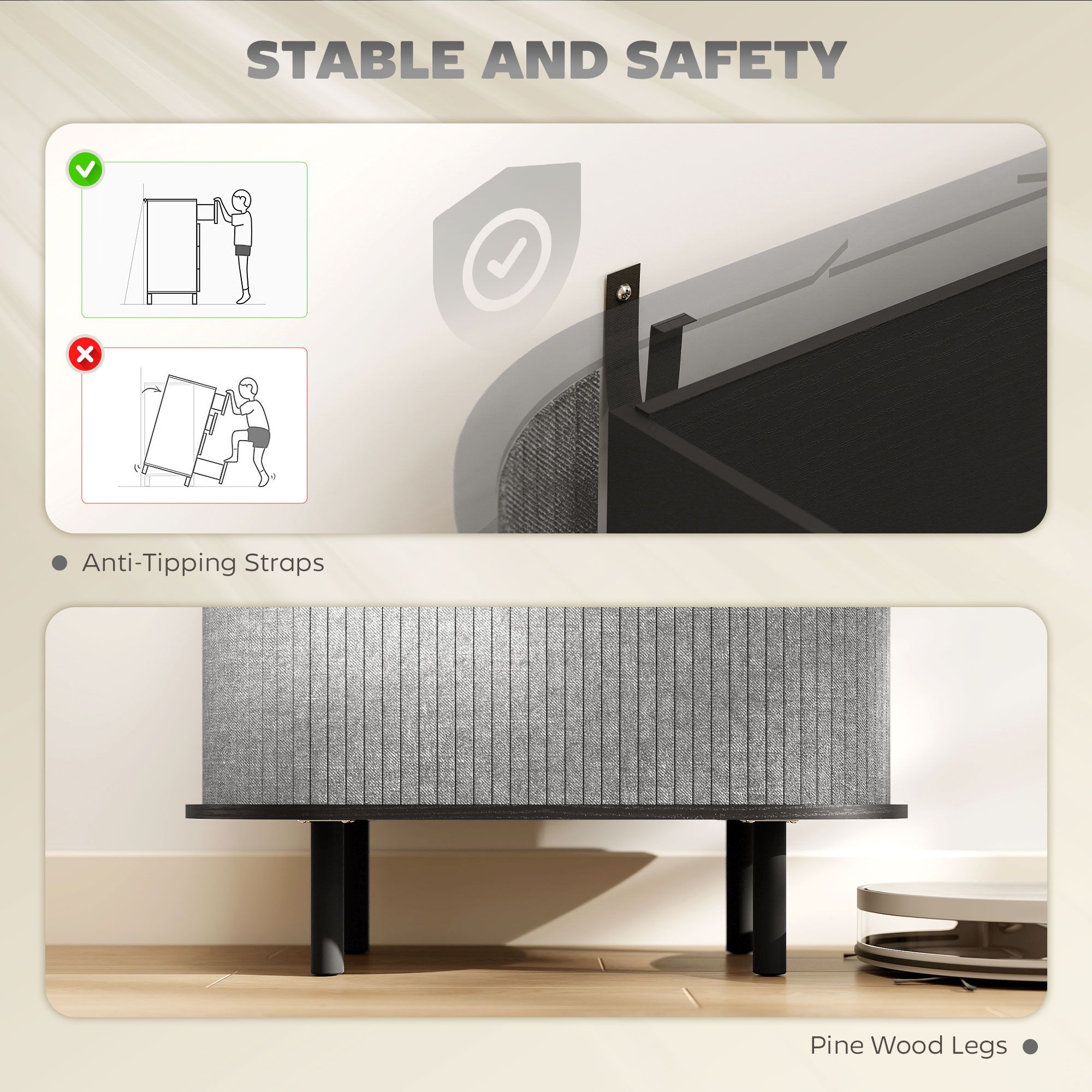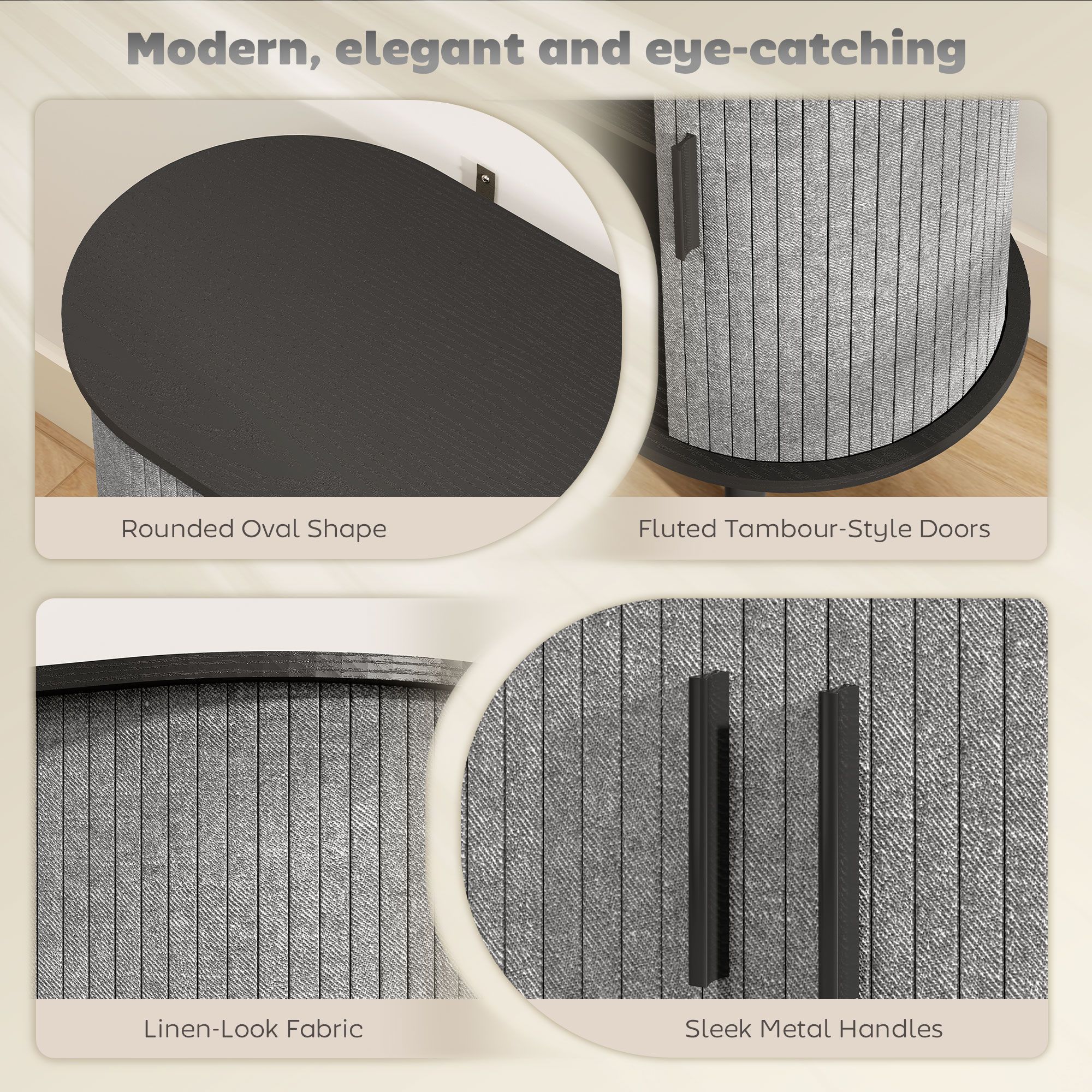 THYRALIUS Tambour Sideboard with Fluted Sliding Doors, Storage Shelves and Wooden Legs - Grey