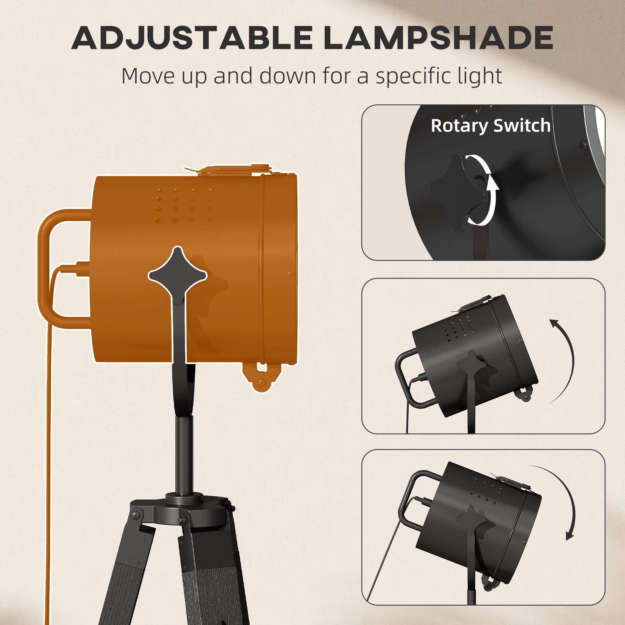 TORVIK Floor Lamp Pine Industrial Tripod Searchlight Adjustable Height - Black