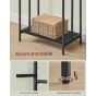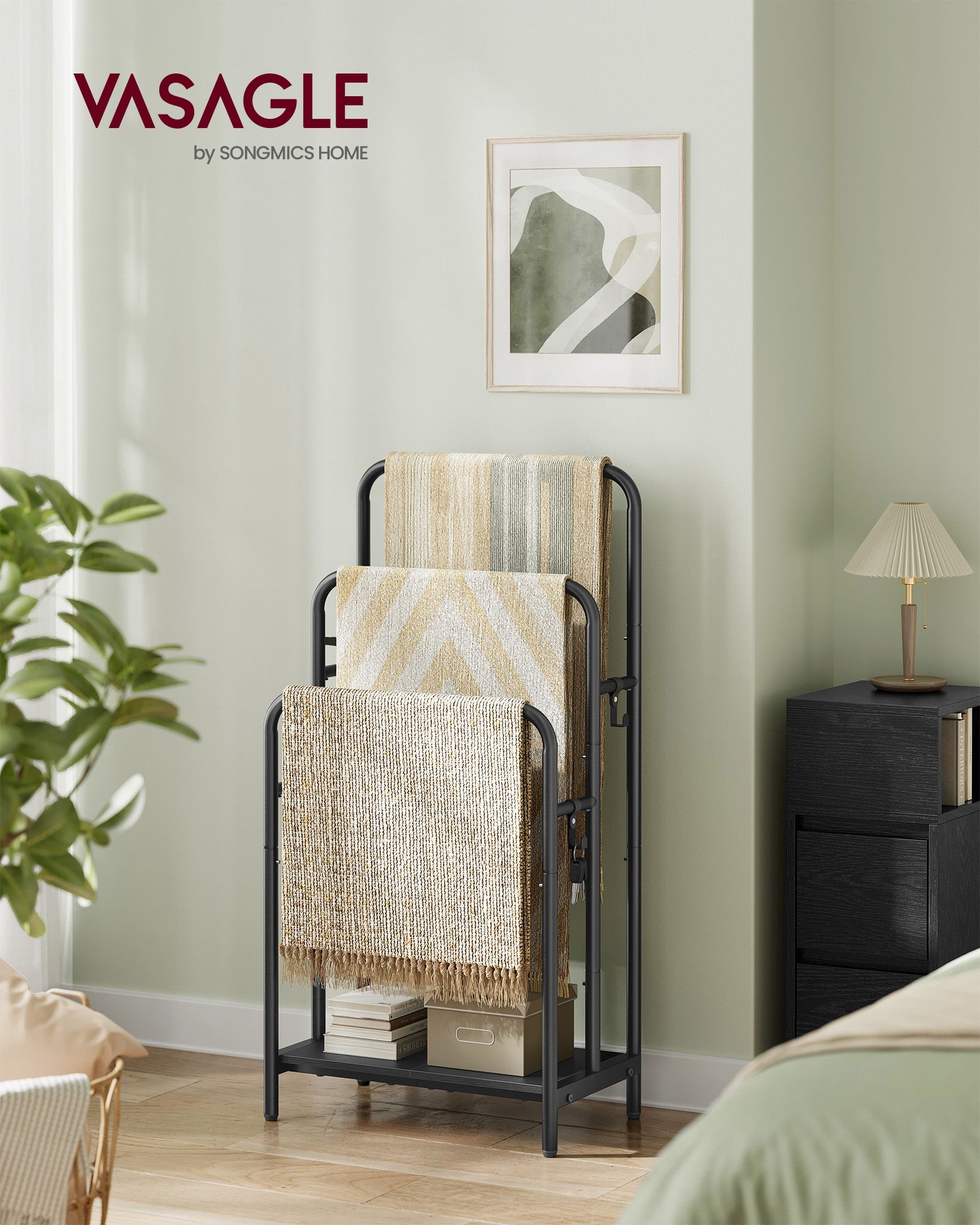 Organize your bathroom with the VASAGLE Freestanding Towel Rack. This stylish and functional rack features three bars for drying towels and two convenient hooks for robes or extra towels. Its sturdy design, with a storage shelf, offers ample space for your bathroom essentials. Measuring 70 x 30 x 100 cm, it's perfect for keeping your towels tidy and accessible in an elegant ink black and ebony black finish.