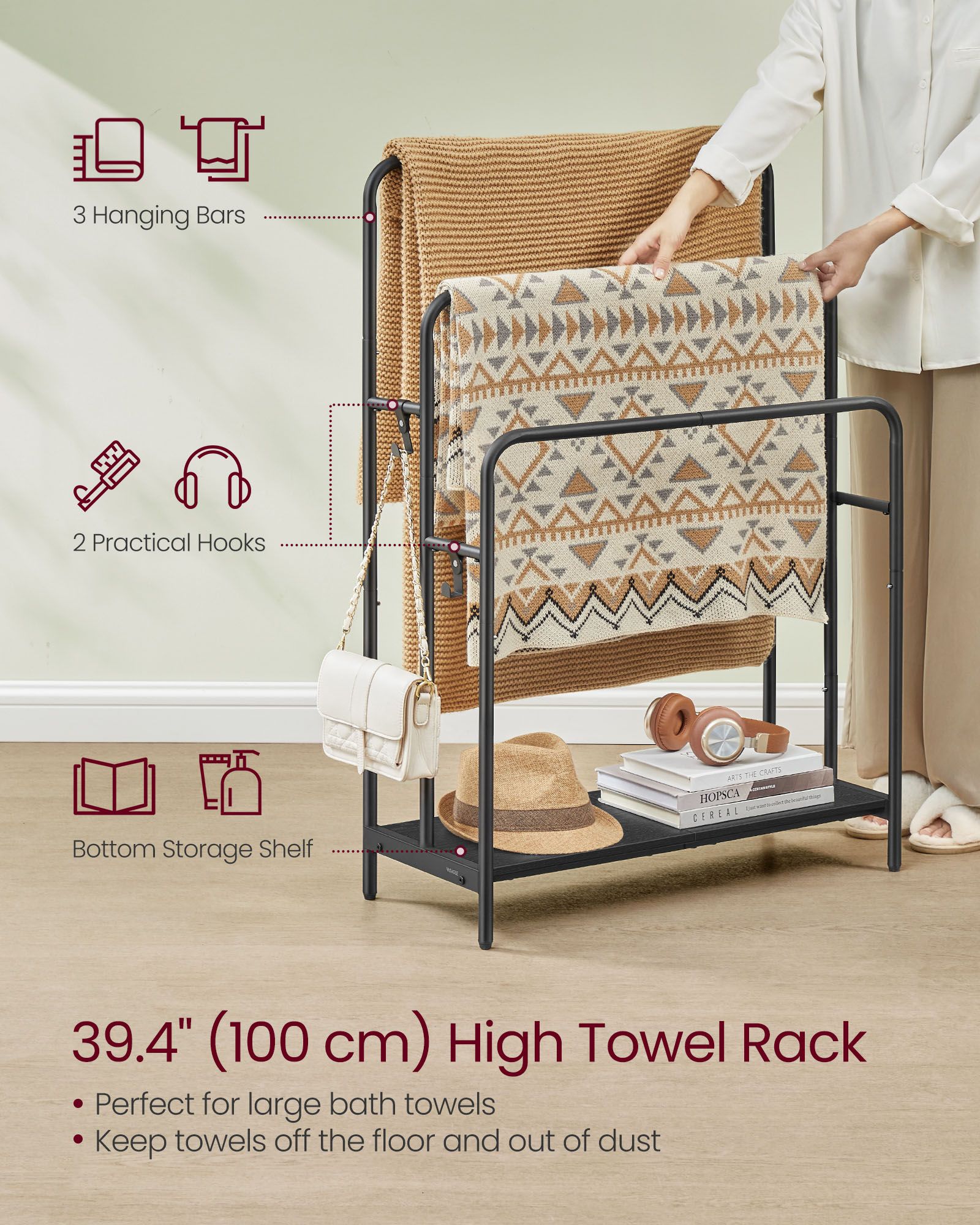 Towel Rack - NOVVAS 3-Bar Rack with 2 Hooks - Ebony Black