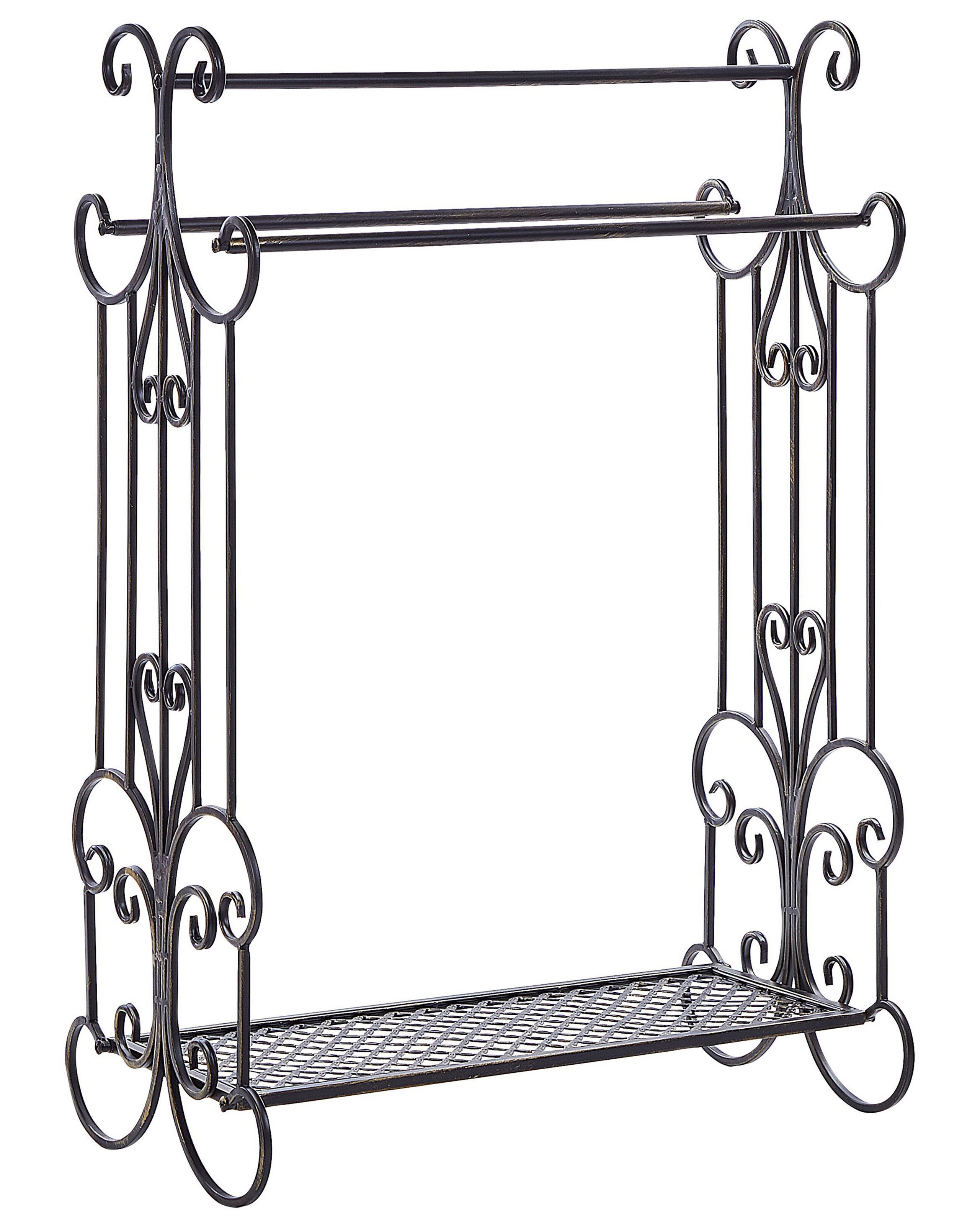 Organize your bathroom space with this towel stand. Made out of iron, the piece is durable and doesn't require time-consuming maintenance. The stand features 3 rails on which you can place your towels, either to dry them, or have them close when you leave the bath. The product also features a shelf on its bottom, where you can place additional items. The whole stand features a unique, distressed and attention-drawing metalwork, so you won't have problems matching it with various interior styles. Details: Color: Black. Main material: Iron. Weight: 3 Assembly: Full Assembly Required Weight Capacity: 10