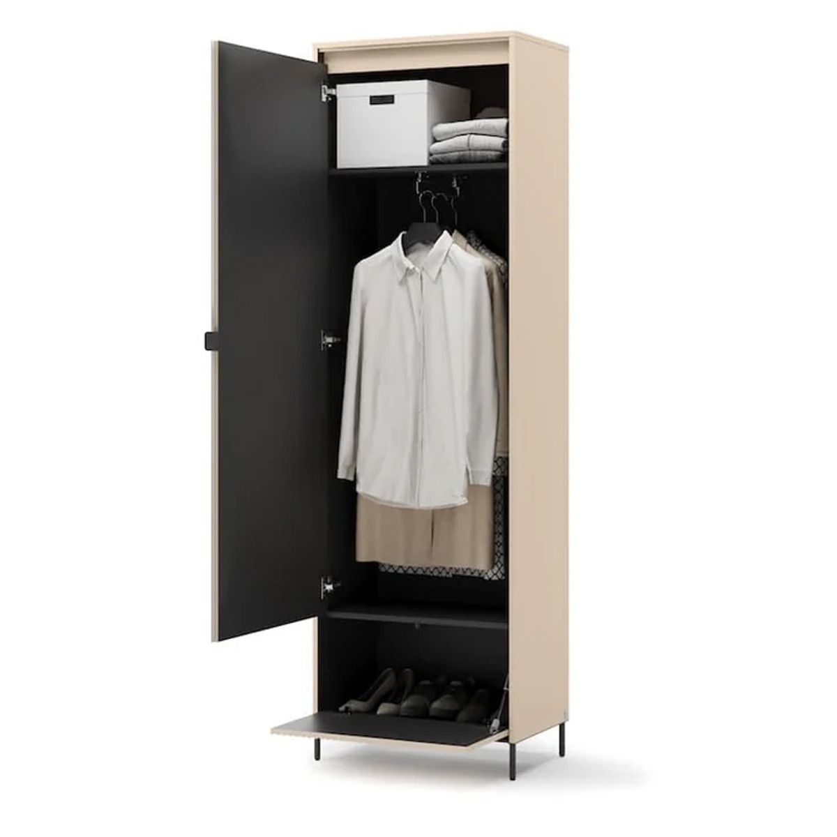 The TRADESSA TG-01 Hallway Cabinet from our TRADESSA Collection is a stylish and functional storage solution for any hallway. Made from high-quality 16mm laminated board, it features two hinged doors, one of which is mirrored, one shelf, one hanging rail, and one closed compartment. Perfect for keeping coats, shoes, and accessories organized, this cabinet combines modern design with practicality.
