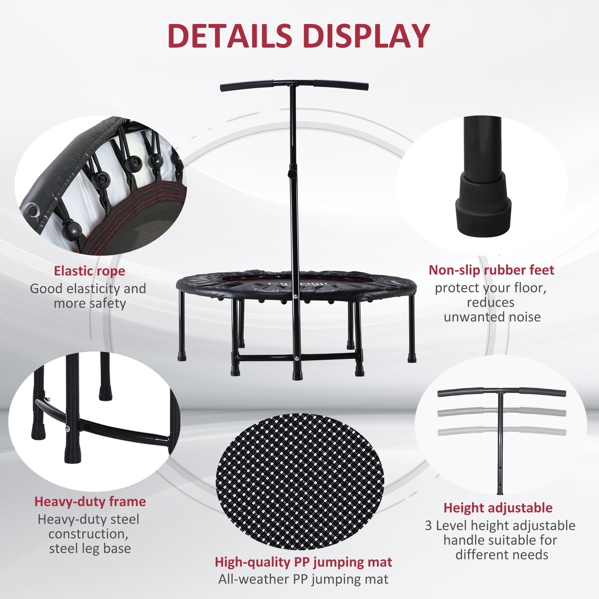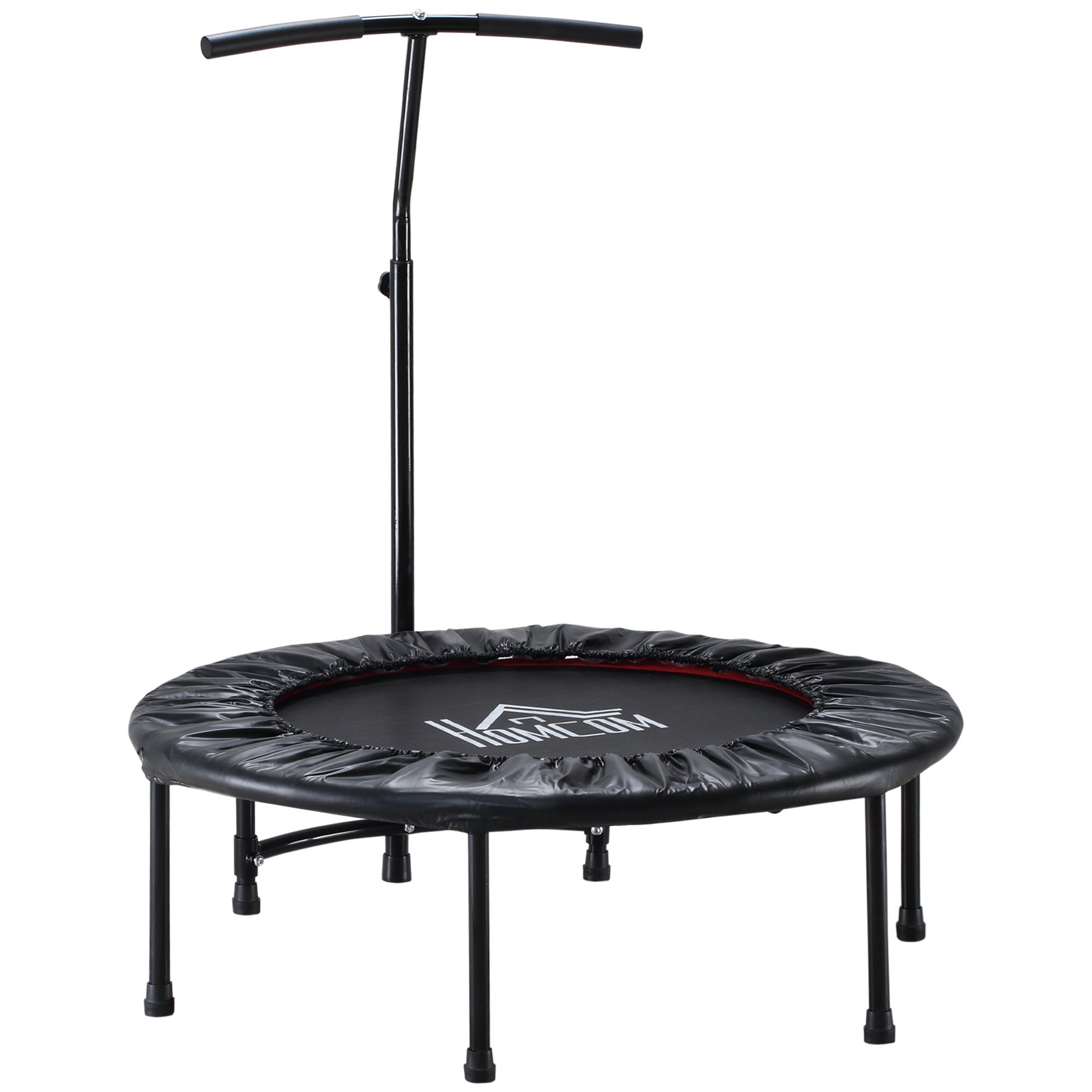 - Rebounder trampoline with support handle makes bouncing safer and is easily adjustable in height.