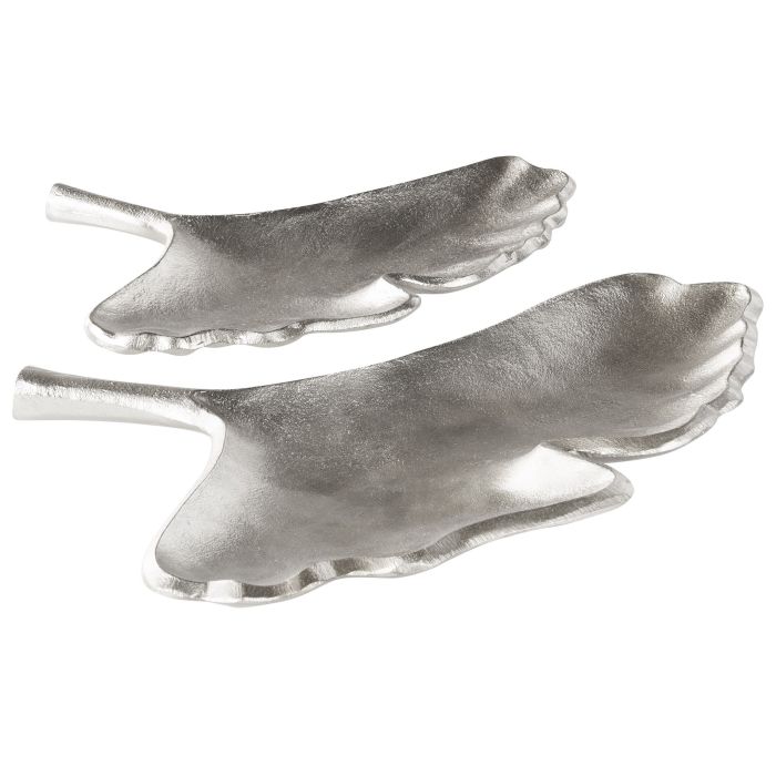 These two aluminium trinket trays make a decorative and handy addition to any living space. Shaped like a ginkgo leaf, they will complement any Japanese styled interior, but will also fit well with any modern home décor. Use them as a jewellery storage or to display your small treasures. This set will surely bring an elegant touch to any bedroom, living area or hallway. Details: Color: Silver. Main material: Aluminium. Weight: 1 Assembly: Does Not Require Assembly