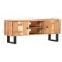 Featuring a trendy yet practical design, this solid wooden TV cabinet will definitely become a focal point of your room. This modern-style TV cabinet, made of solid acacia wood and powder coated steel, will make a timeless addition to your home. Every step of the process is carried out with the greatest care, be it polishing and painting. It has 2 doors for storing knick-knacks and 2 open compartments for keeping multimedia appliances, gaming consoles and magazines. This TV cabinet is easy to assemble. Important note: Colours vary from piece to piece, making each of our TV cabinets unique; the delivery is random.