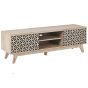 This TV stand is made from easy to care laminated particle board. Because it was designed in an ever-trendy retro style with its ornamented cabinet's doors, the piece will add elegance to your living room. The unit will serve both as a cabinet to store your music discs or games and as a place for your TV. Thanks to the fact that it is equipped with leg caps, you don't need to worry about your floor getting scratched. Additionally, a cable hole will allow you to organize your wires for a clean look. Details: Color: Light Wood, Black. Main material: MDF. Weight: 23 Assembly: Full Assembly Required