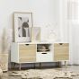 Upgrade your living room and entertainment area with this modern TV stand cabinet. Blending together wood effect doors and a white structure for modern style, this entertainment unit looks great all throughout the home. Formed of a wide top, middle open shelf, drawer two end cupboards. The TV console complete with wooden legs to support properly.