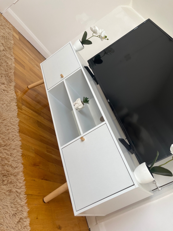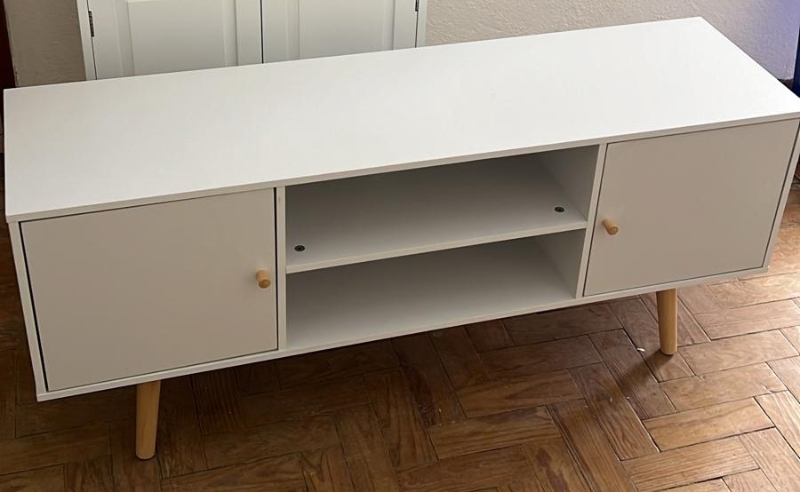 Upgrade your living room with this media console. This TV stand does more than holding your TV, it has two open shelves and two cupboards to provide large storage space for your favourite movies, a collection of video games or books you love to read. Additionally, there are two cable holes for organising wires without the mess. Without a doubt, this media unit will be a perfect companion for your relaxing moments.