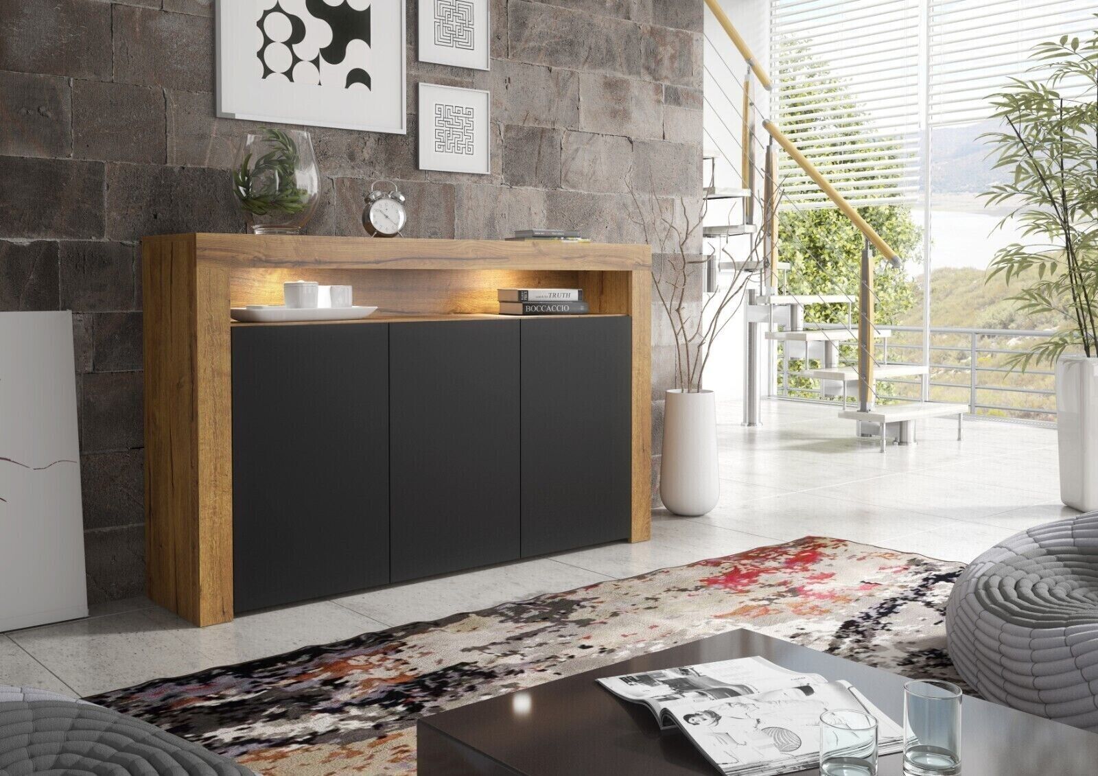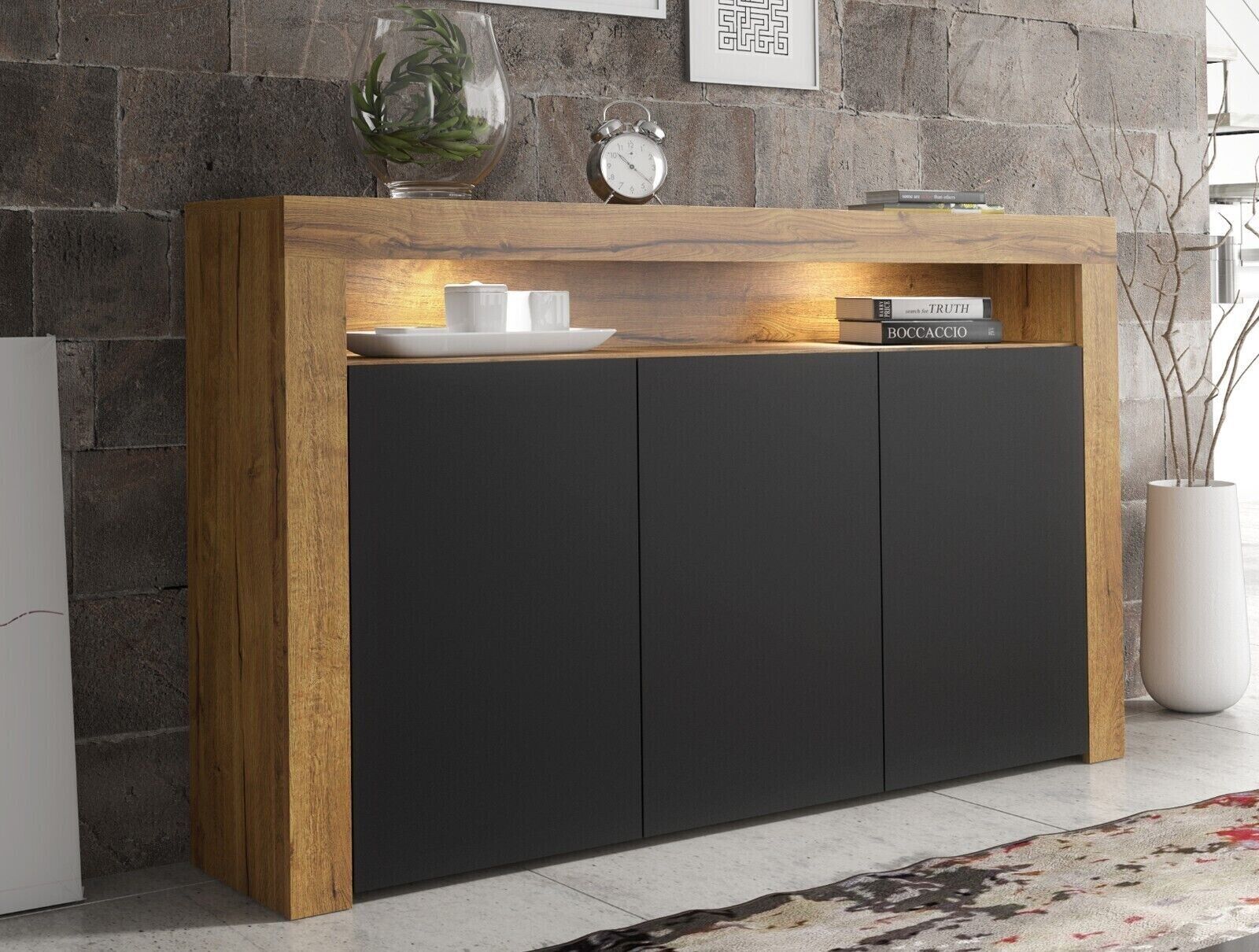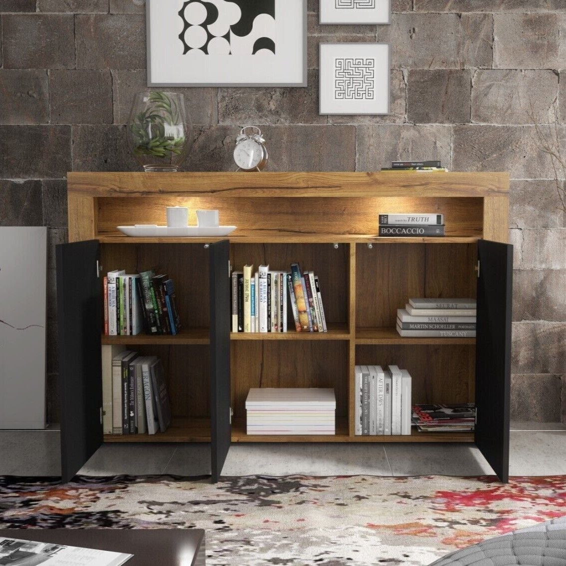 TV Unit Sideboard Cabinet with 3 Doors Storage and Free LED Lighting 155cm - Oak and Black