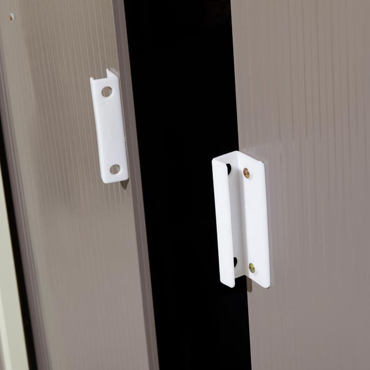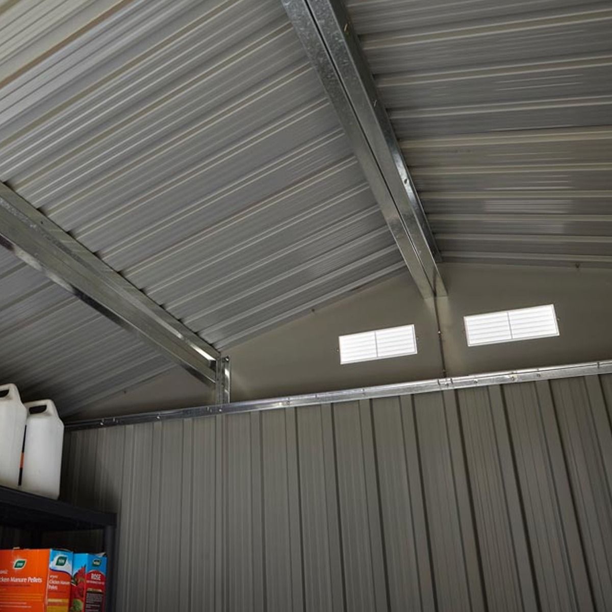 Constructed from electro-galvanized and painted steel with a 0.25mm thickness, this shed is both fire and rot resistant, ensuring long-lasting durability. The dark grey finish with off-white trim gives it a modern and attractive appearance. Designed for low maintenance, the 8×6 Tyson Metal Apex Style Shed is an ideal choice for busy homeowners. The door is fitted to the 8′ side only, optimizing the layout for efficient use of space. Available in both dark grey and light grey with off-white trim, this shed combines functionality with contemporary style.