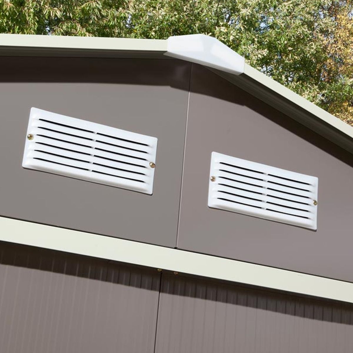 Introducing the 8×6 Tyson Sliding Double Door Metal Apex Style Shed, a robust and stylish storage solution designed to enhance any outdoor space. This shed features an apex style roof and double sliding doors, providing convenient and secure access to your belongings. The doors are lockable (padlock not supplied) for added security. Gable vents are integrated to ensure better air circulation, keeping the interior dry and well-ventilated.