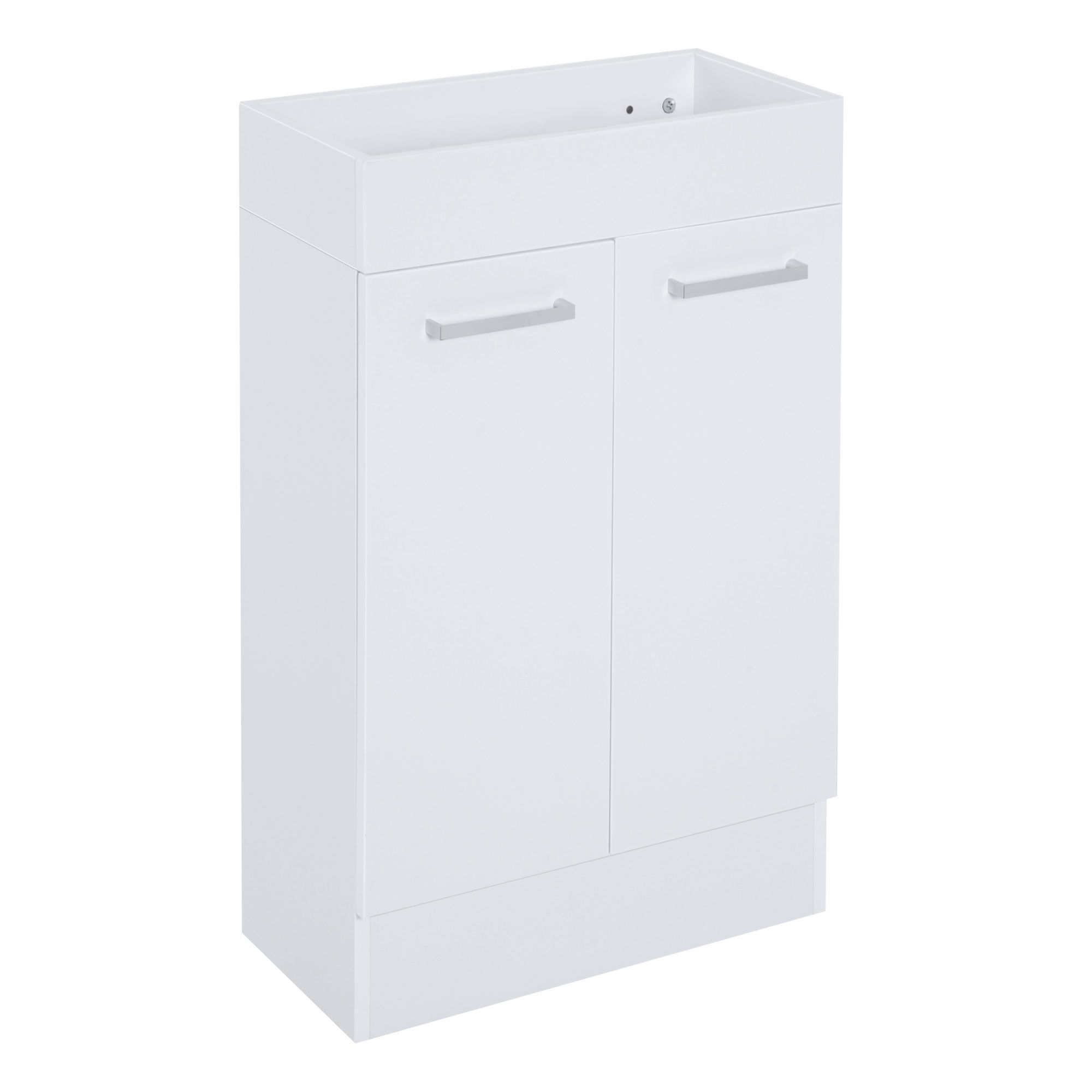 - SPACE SAVING: This bathroom vanity cabinet comes in white finish, includes soft closing doors, an integrated wash basin and a zinc alloy handle. Compact design for small spaces, bathroom, kitchen.