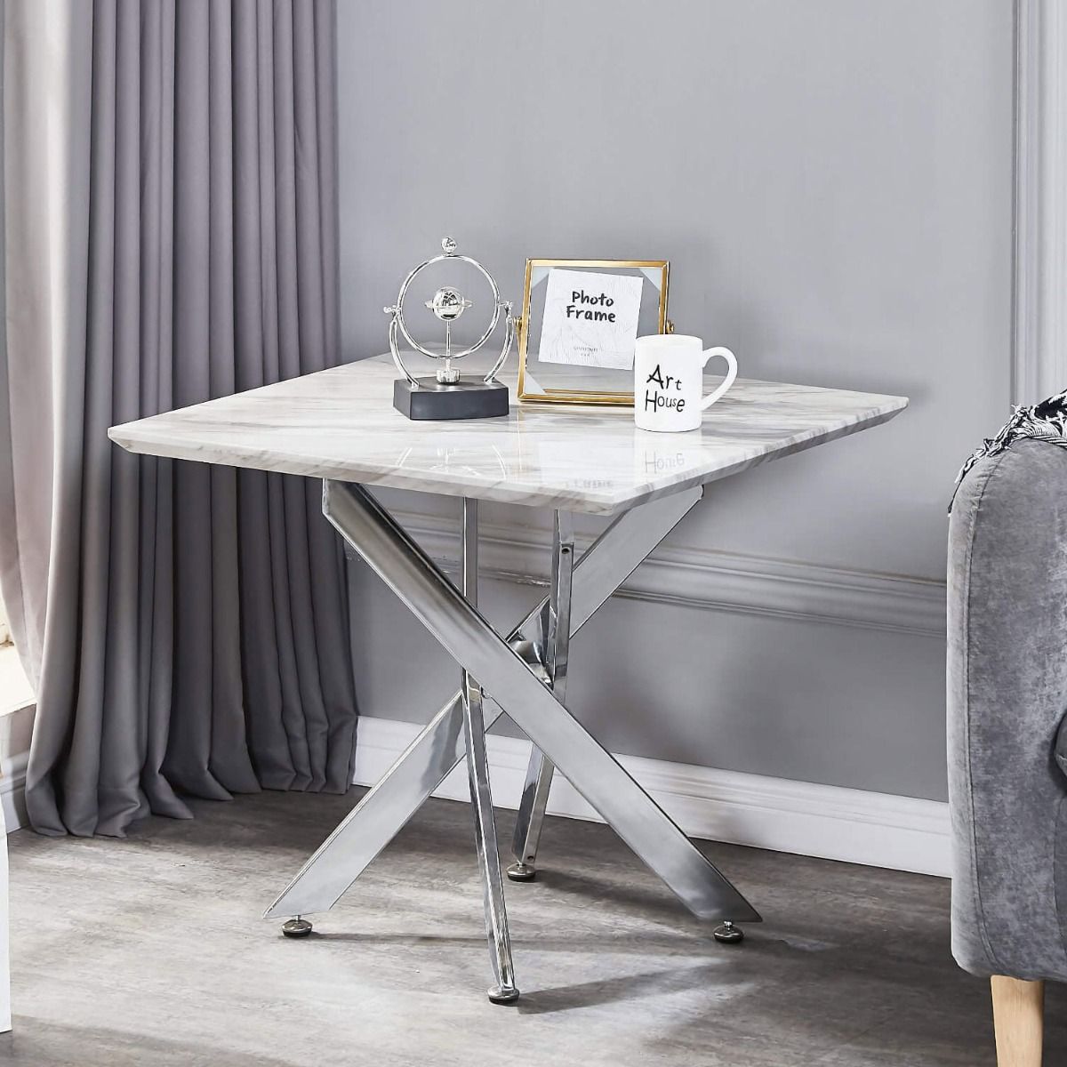 Introducing the Vaxton Marble Lamp Table with Silver Legs, a captivating piece from the Vaxton collection offered by Home Done. This square lamp table boasts a luxurious marble effect tabletop complemented by metal chrome legs, adding a touch of sophistication to your living space. This table serves as a functional and stylish addition to your home decor. Explore the Vaxton collection and elevate your interior with timeless design and contemporary flair.