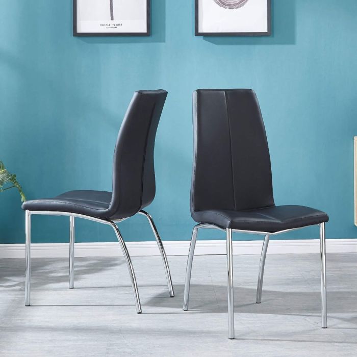 Enhance your dining area with the Vaxton PU Chairs featuring a modern design and chrome legs. This set of two black PU chairs from the Vaxton collection by Home Done combines style and comfort seamlessly. The leather-effect material adds a touch of sophistication, making these chairs suitable for various settings. Elevate your dining experience with the contemporary flair of Vaxton furniture.